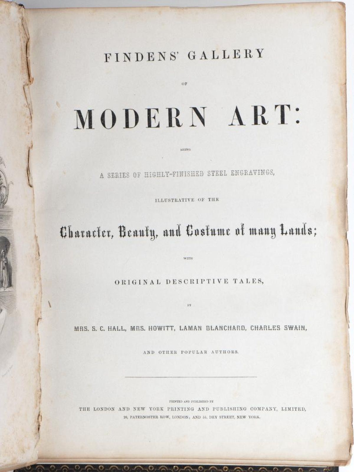 FINDENS' GALLERY OF MODERN ART: BEING A SERIES OF HIGHLY-FINISHED STEEL ENGRAVINGS, ILLUSTRATIVE OF THE CHARACTER, BEAUTY, AND COSTUME OF MANY LANDS; WITH ORIGINAL DESCRIPTIVE TALES BY MRS. S. C. HALL, MRS. HOWITT, LAMAN BLANCHARD, CHARLES SWAIN AND OTHER POPULAR AUTHORS. London and New York: The London and New York Printing and Publishing Company, Limited, n.d. (c. 1840s). Vol. I and II in a single folio volume (14 7/8 x 11 in.). Front and back covers paneled with gilt classical vase decoration; spine with raised bands interspersed with gilt leaves. Fair. Both boards and spine leather are fully detached. Front free endpaper and engraving are detached. All 60 black and white steel engravings are present. There is foxing throughout but mostly it's light and at the extremeties and/or back of engravings. One engraving has a small tear at the bottom.