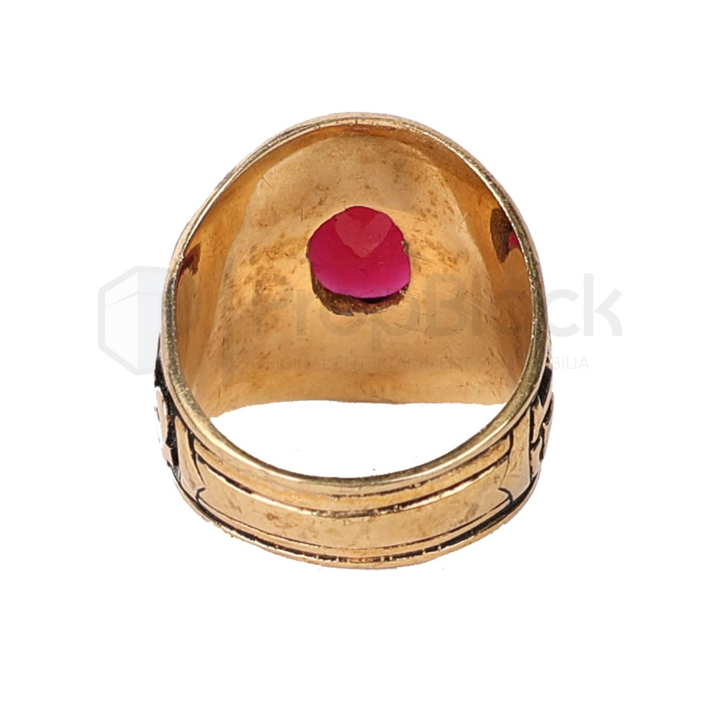 Pinky Ring worn by Sean Connery as William Forrester inn the 2000 drama Finding Forrester. A unique relationship develops between an eccentric, reclusive novelist and a young, amazingly gifted scholar-athlete. After the novelist discovers that the young athlete is also an excellent writer and secretly takes him on as his protégé, they develop an unlikely friendship. As they learn more about each other, they learn more about themselves, and ultimately, with the help of his new mentor, the basketball star must choose the right path. This is a gold metal college alum style ring with a large faux red gemstone inset on the top. This item features detailing on each side with a faint black wash to bring out the cast in designs. This piece remains in excellent, production used condition.