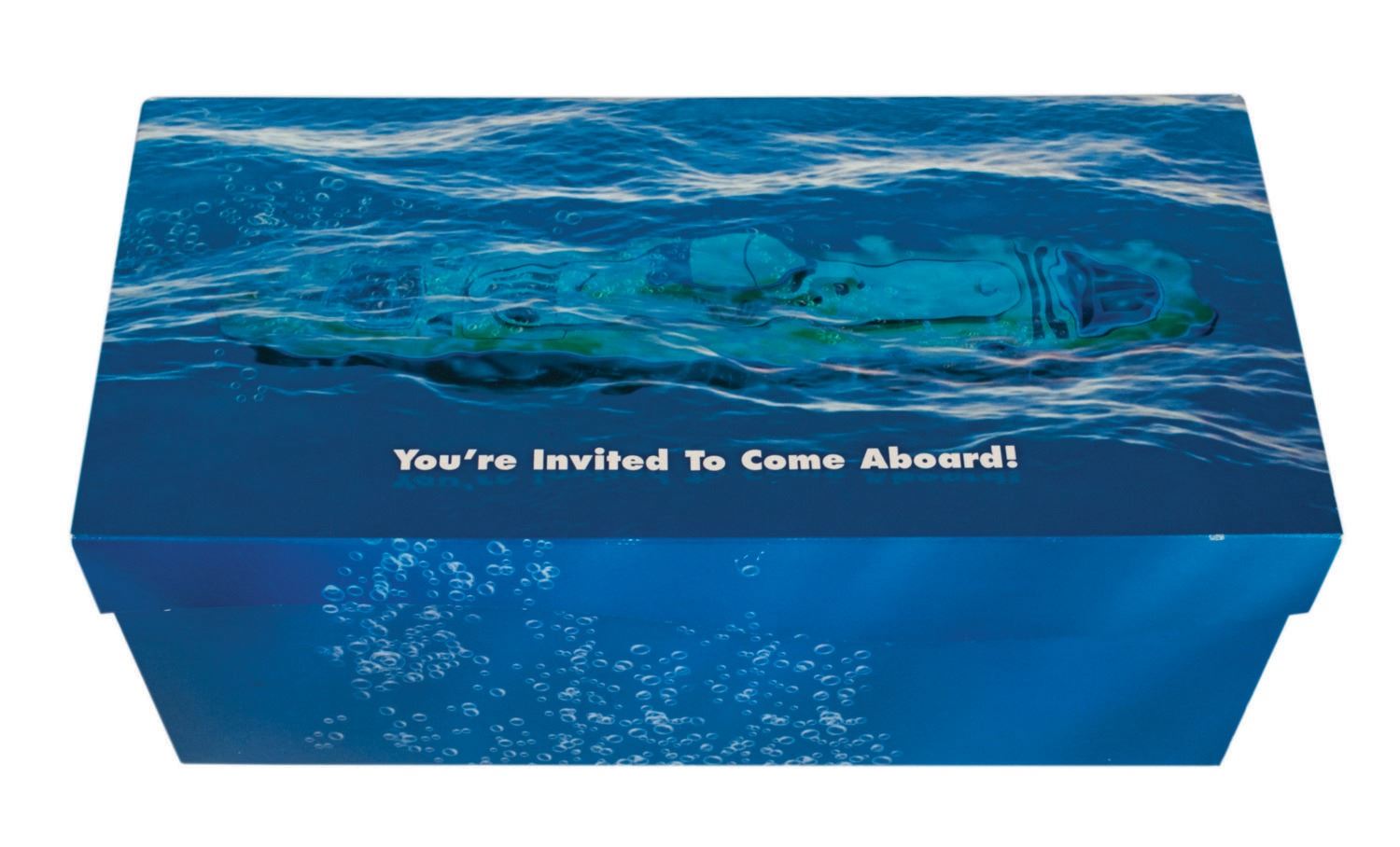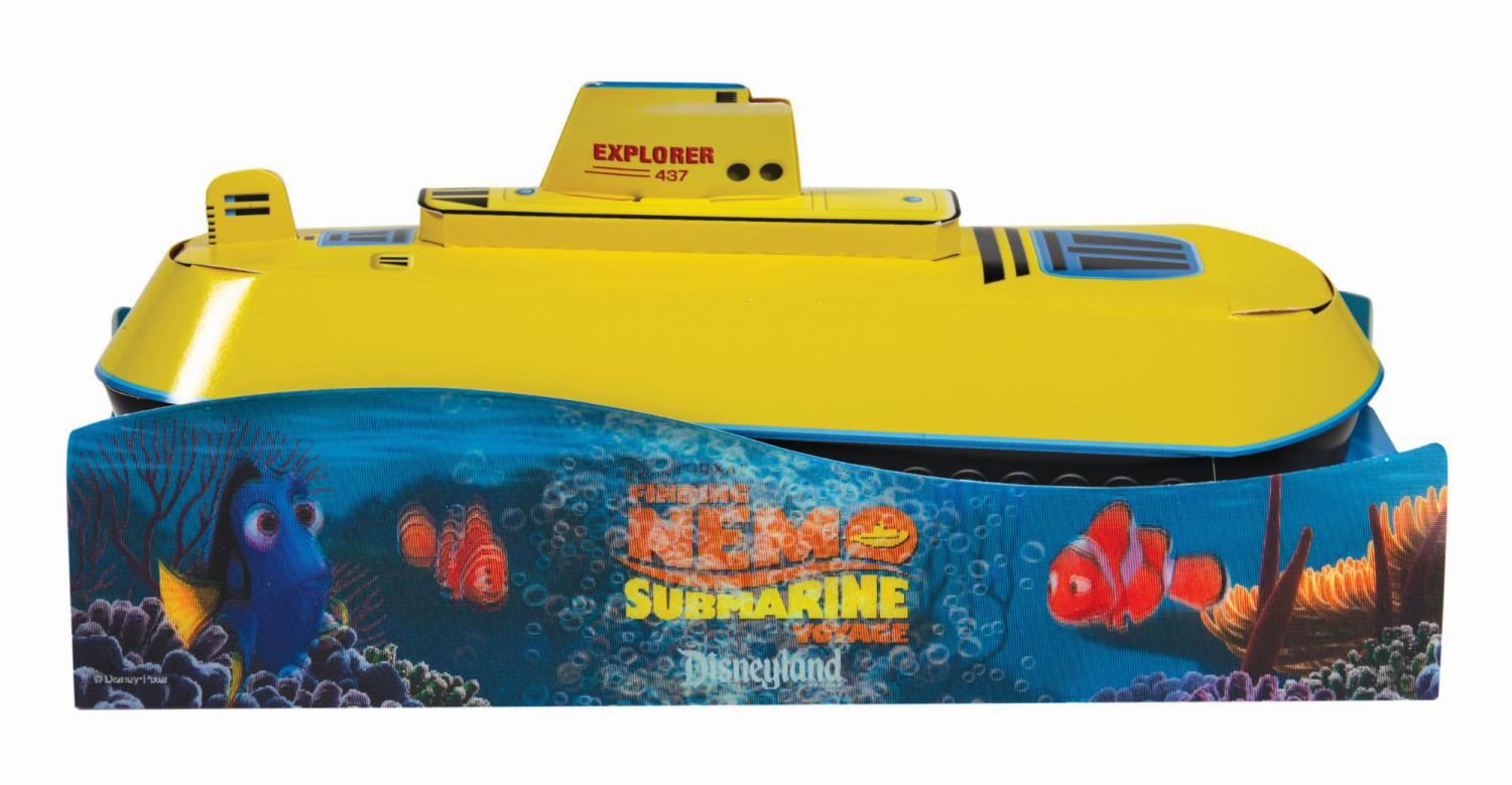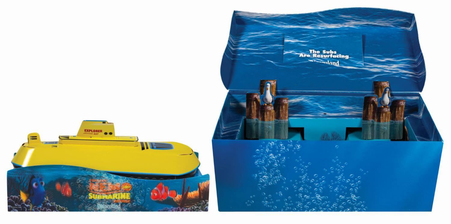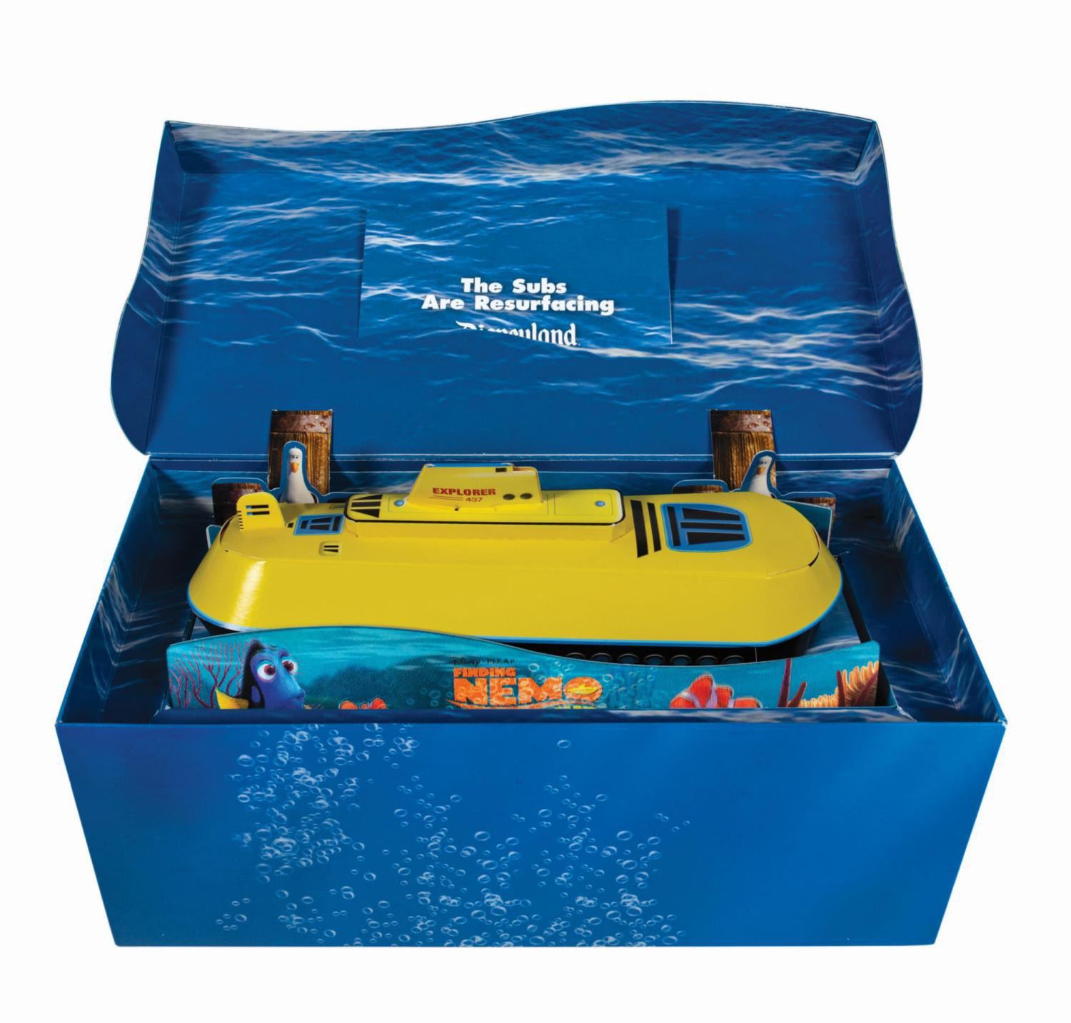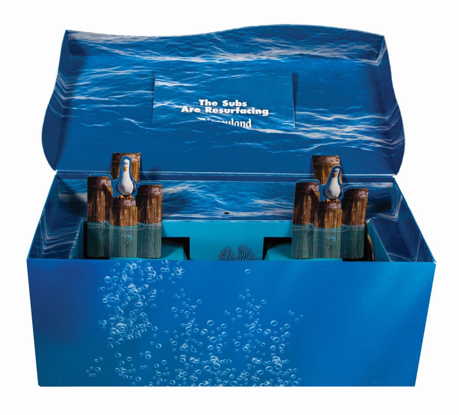 (Disneyland, 2007) A rare submarine pop-up model display and press invitation to the official Premiere Party of the Finding Nemo Submarine Voyage attraction at Disneyland. The piece consists of a cardboard box with an integral lid. When the lid is lifted, a removable 3D cardboard model of one of the attraction's submarine ride vehicles with ocean floor lenticulars lining the base is raised to top of the box. A printed cardstock invitation with the tagline, "The Subs are Resfuracing" and detailed event information slides into a slit on the interior of the lid. Measuring 5.5"x11.75" and 4.75" deep, the set is in very good condition with some minor edge wear and handling to the box and a crease to one of the interior seagull cutout figures.
