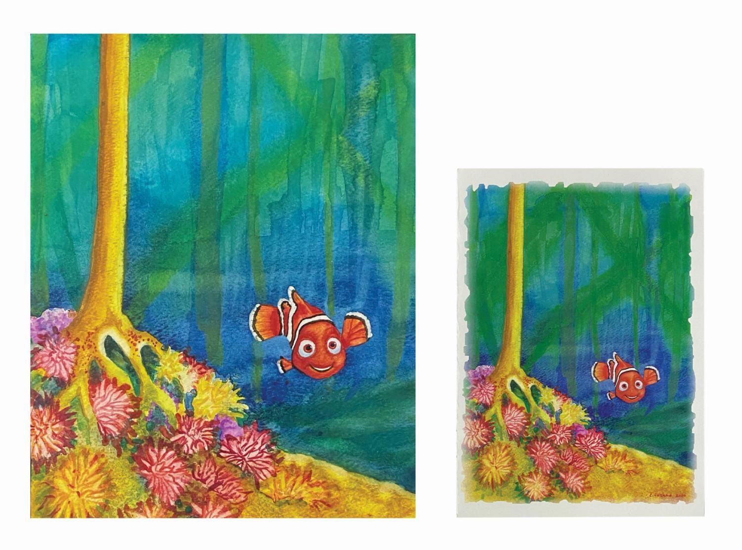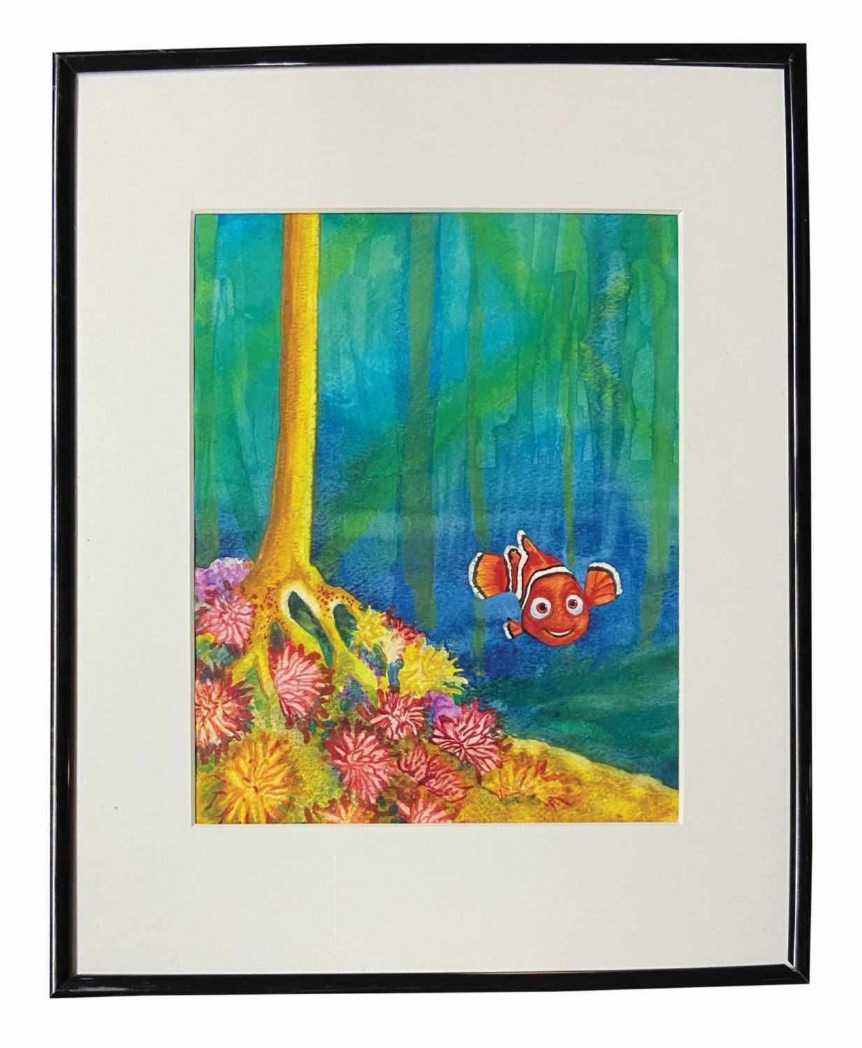 (Animal Kingdom, 2006) An original watercolor painting of Nemo created for a card celebrating the premiere of Finding Nemo The Musical. This beautiful watercolor features Nemo against an underwater background. Included is the final card, intended for cast and crew, with the painting image on the front and the interior reading "Congratulations on making a Big Splash with Finding Nemo The Musical!" Measuring 9.25"x7.25" in its 14.5"x11.5" frame, the painting is in very good condition. The frame itself shows some wear, particularly at the lower right where the two sides are separating at the corner. The card shows minimal edge-wear.
