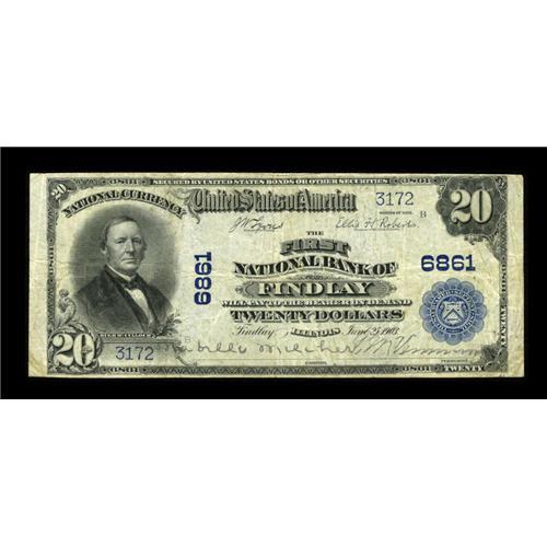 <B>Findlay, IL</B></I> - $20 1902 Plain Back Fr. 650 <B>The First NB</B></I> Ch. # 6861<BR>This Shelby County issuer was liquidated in 1927 leaving this town with no bank. The other bank in town closed in 1907 leaving this as the only collectible institution here as the other is unreported. Pleasing <B>Fine-Very Fine</B></I> with stamped signatures remaining.<BR><I>From The Lincoln Collection</B></I><BR><BR><b>Shipping:</b> Coins & Currency (<a target="_blank" href="http://www.heritageauctions.com/common/shipping.php">view shipping information</a>)