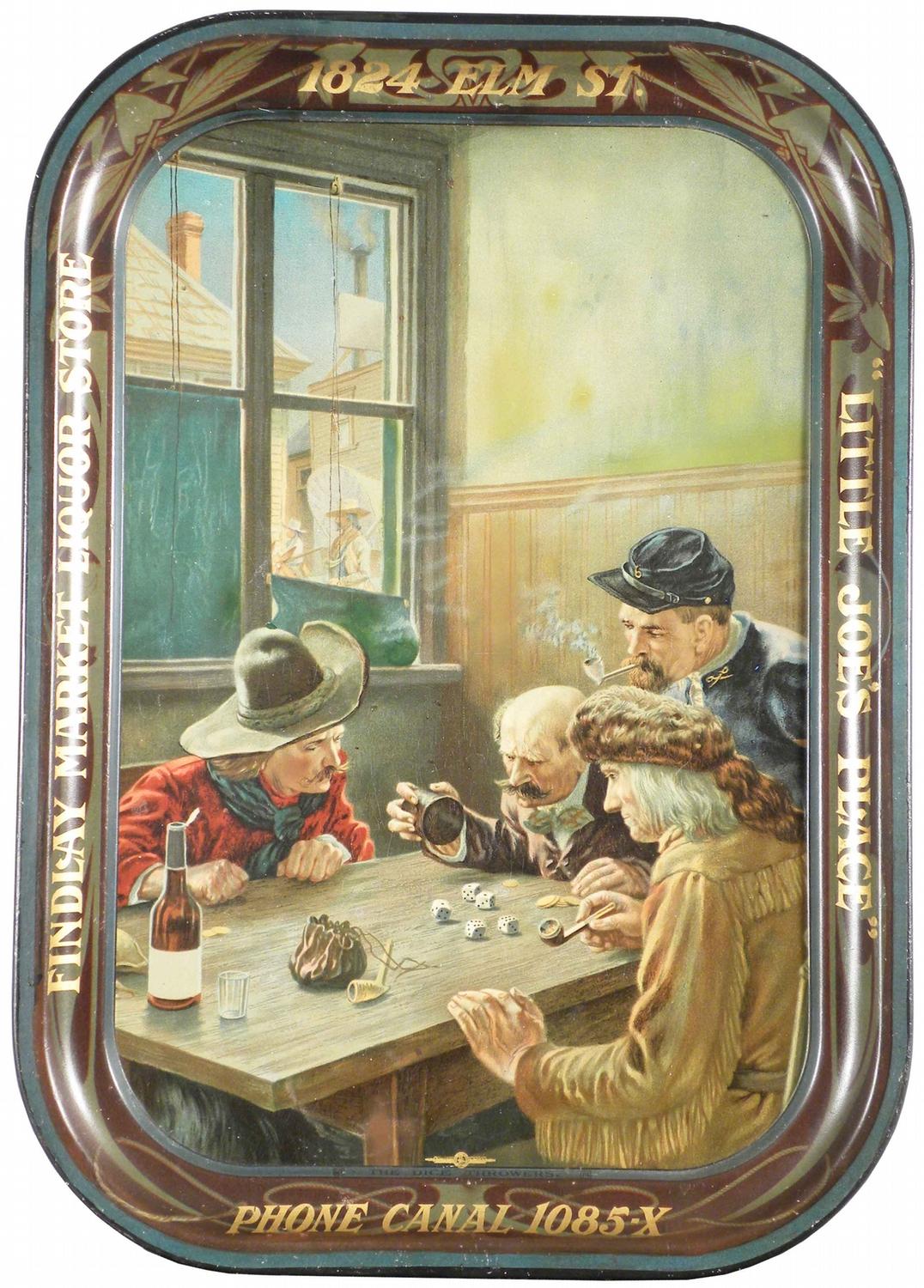 Findlay Market Liquor Store Tin Serving Tray. Entitled, "The Dice Throwers". "Little Joe's Place". Depicting men gambling. Some minor professional restoration. 12 1/4 X 17 1/4 inches.
