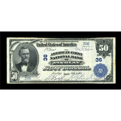 <B>Findlay, OH</B></I> - $50 1902 Plain Back Fr. 675 <B>The First NB</B></I> Ch. # 36<BR> A nice high denomination example from this sought after low charter bank. Pleasing <B>Very Fine+, </B></I>with clear signatures. <BR><BR><b>Shipping:</b> Coins & Currency (<a target="_blank" href="http://www.heritageauctions.com/common/shipping.php">view shipping information</a>)