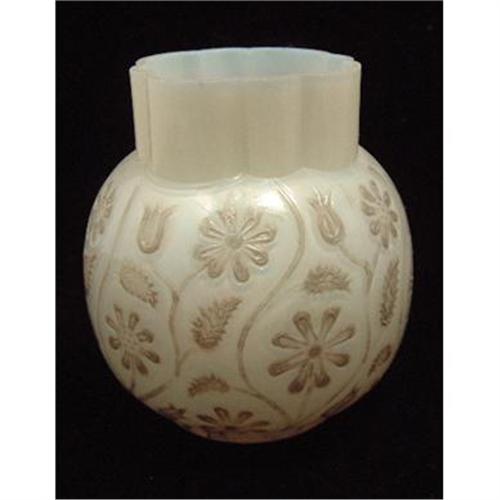 This is a beautiful and rare piece of Findlay Onyx glass. this is called a spooner. This glass was made for less than a year in 1889. It was made by Dalzell, Gilmore and Leighton factory in Findlay, Ohio. Because of the brittle nature of the glass and blown layers, production did not last for very long. The pattern is Onyx, decorated with beautiful cased flowers and leaves. It is in beautiful condition with only a few very small, teeny, flea bites to the rim, which is not unexpected from this glass, and does not detract from the value, because of the extreme rarity of this glass. It has a polished mouth. It is 4 1/2" high. A beautiful piece of rare American glass.