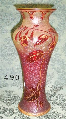 Fine 12” cranberry to clear cameo style vase with bleeding heart and vine and leaf decoration on an all-over etched background