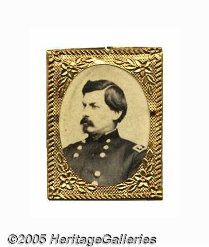 <B>Fine 1864 George McClellan Cardboard Portrait</B></I> Rare attractive portrait encased in brass shell "gem" frame. No pin on reverse as made. (Listed by Sullivan as GMcC 1864-46. He shows it attached to ribbon, as this one probably was originally intended to be.) First time we recall handling this distinctive McClellan image. Choice condition. 3/4" x 1". Lot:258