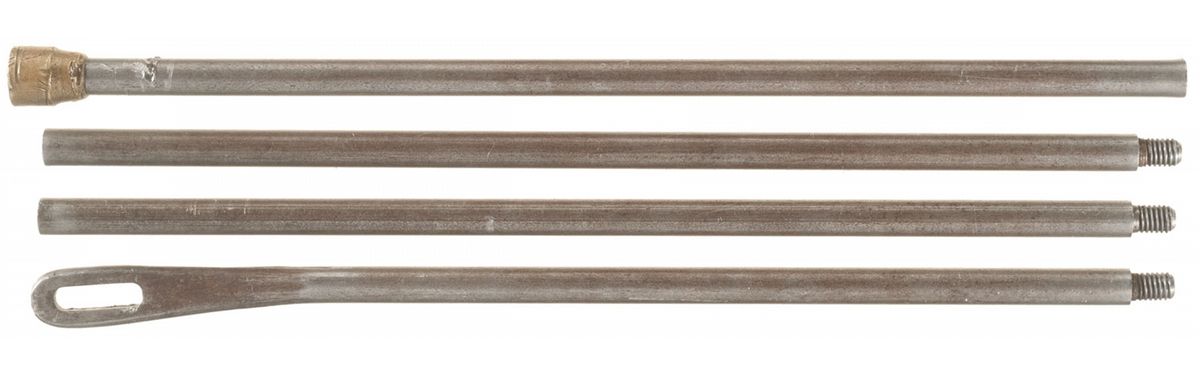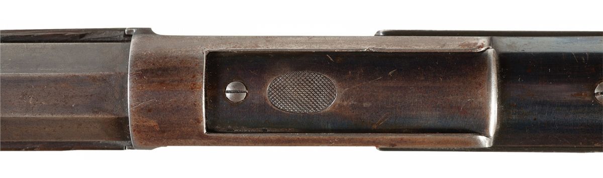 Manufactured in 1878. This First Model 1873 Winchester Rifle features the distinctive dust cover held in place by grooved guides on either side of the top of the receiver, raised checkered oval finger grip on top of the dust cover and the lever latch with the visible screw threads. The top barrel flat is marked with the two line address/Kings Improvement patent dates ahead of the rear sight, the upper tang is marked "MODEL. 1873" and the serial number is marked on the lower tang. The rifle is correctly absent of caliber markings. Dovetailed German silver blade front and adjustable buck horn sporting rear sights, full length magazine tube, blue finish with casehardened hammer and lever, and mounted with a smooth walnut forearm with a steel forend cap and straight grip stock with a crescent buttplate, with buttstock compartment containing a four piece cleaning rod.