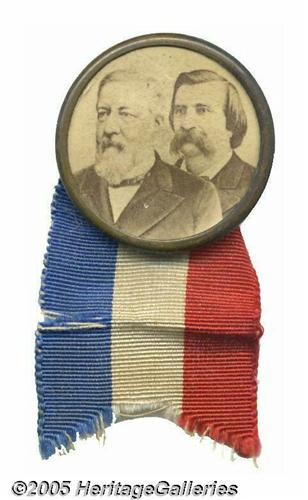 <B>Fine 1884 James Blaine and John Logan Jugate Pin</B></I> When in nice shape such conjoined-bust jugates are a refreshing change from the typical versions with separate photos. Usually, however, the large paper surfaces are faded and/or scuffed. This one is in great shape, with original pin and red white and blue ribbon (which shows some aging). While lacking that sparkly "minty" sheen, this is nonetheless surely the best example we have encountered. Diameter 30 mm. Lot:259
