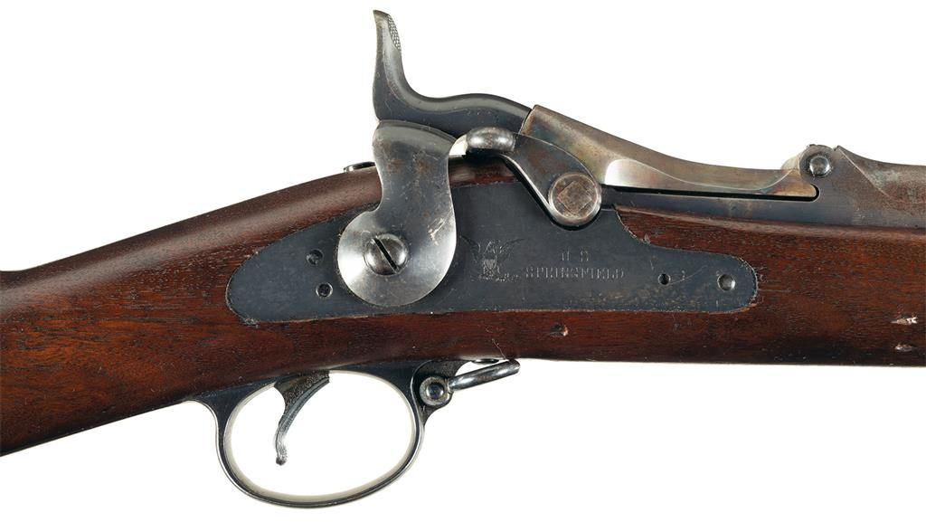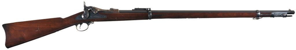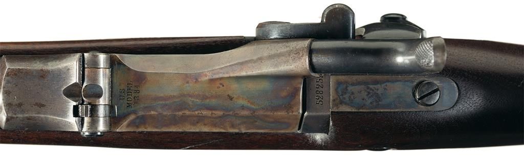 This is a very fine example of a late production Model 1884 trapdoor rifle that includes the Model 1888 Round Ram-Rod sliding bayonet. This model was the final configuration of trapdoor rifles used by the U.S. Military until the fielding of the 1892 Krag rifle. The left rear section of the barrel is marked with the "V", "P" and Eagle head proofs in front of the receiver with a small "A" proof directly on top in front of the receiver and the top of the breech block is marked "US/MODEL/1884". The lock is the correct late three click tumbler version that is marked with the American Eagle and "U.S. SPRINGFIELD" ahead of the hammer. This version has been fitted with the "new" one-piece trigger guard, and steel buttplate with the trapdoor compartment. It is fitted with the improved Buffington rear sight that is adjustable for windage and elevation and a pinned front sight blade. The stock is the correct full length version that is marked on the left wrist with a boxed script "SWP/1891" cartouche and behind the trigger guard it has single circled script "P" proof. The rifle is complete with an original ruptured shell extractor in the butt-trap compartment.