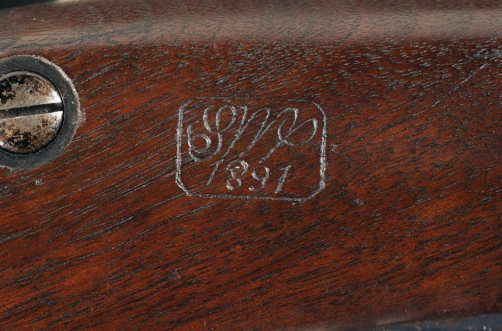 Very fine with 85% plus of the original blue finish overall on the metal parts with the breech end of the barrel and very front edge of the receiver, browning out and showing some very minor loss of finish where the rifle has been handled over the years. The breech block retains 80% of the original case color, just starting to fade a little on the firing pin hump. The stock is also in very fine condition with its nice original finish showing only some minor handling marks on the right side of the butt with a couple minor pressure dents in front of the lock plate and a small chip around the front edge of the trigger guard. It has a clear sharp cartouche and firing proof.