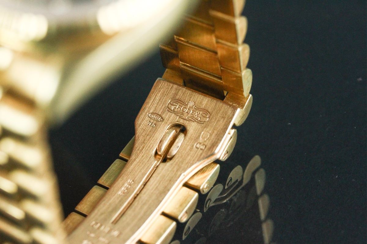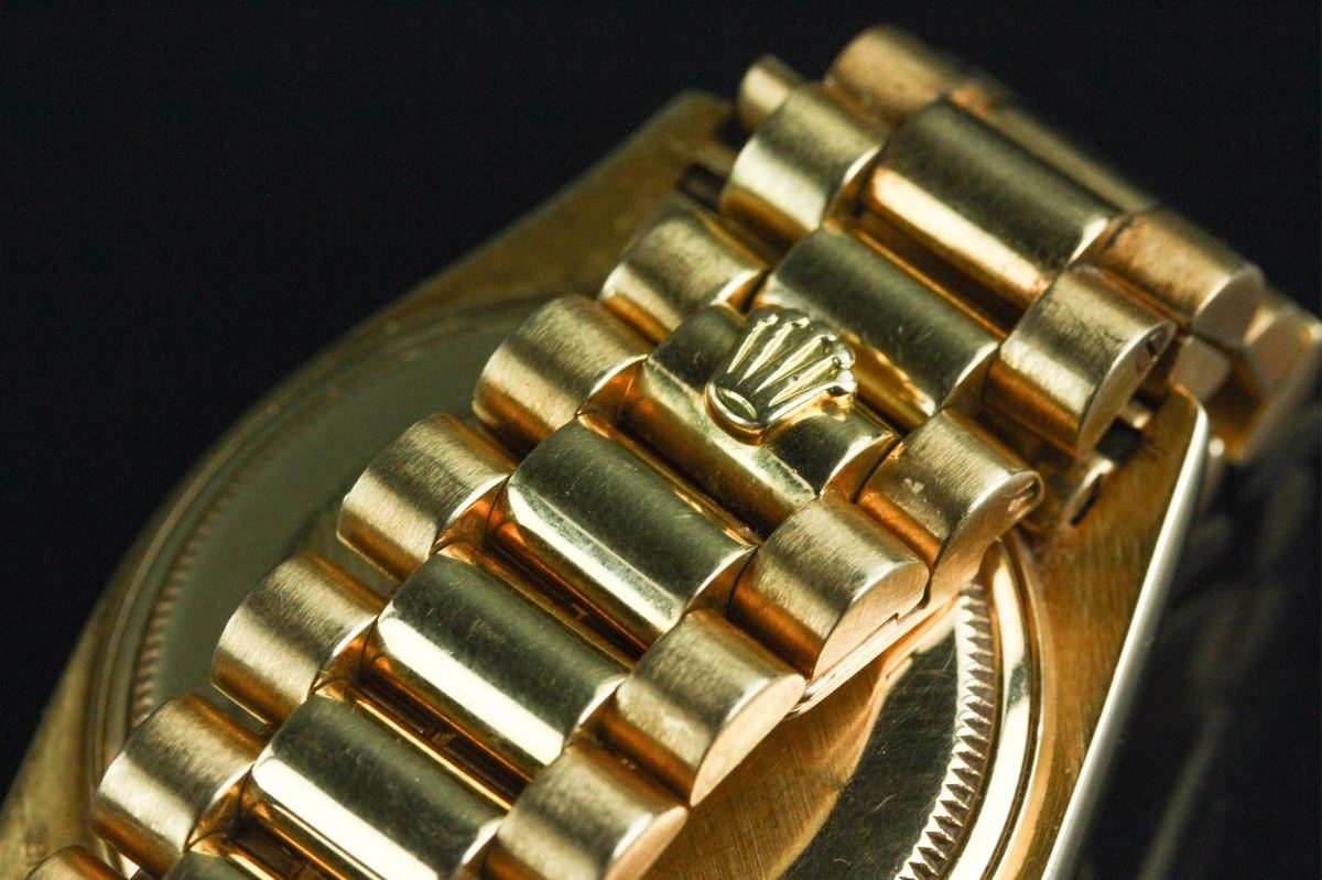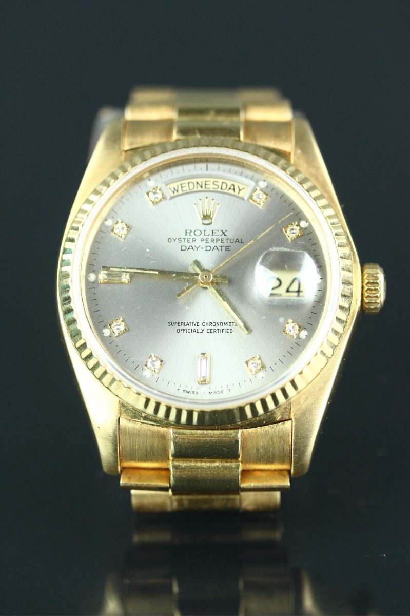 Rolex Oyster Perpetual Day-date Superlative Chronometer Officially Certified wristwatch; with diamonds dial, fluted bezel and semi-circular three piece links bracelet; Swiss Made 18K marked; D: 5 cm, 127 grams