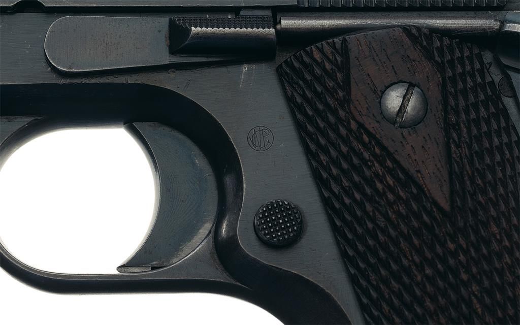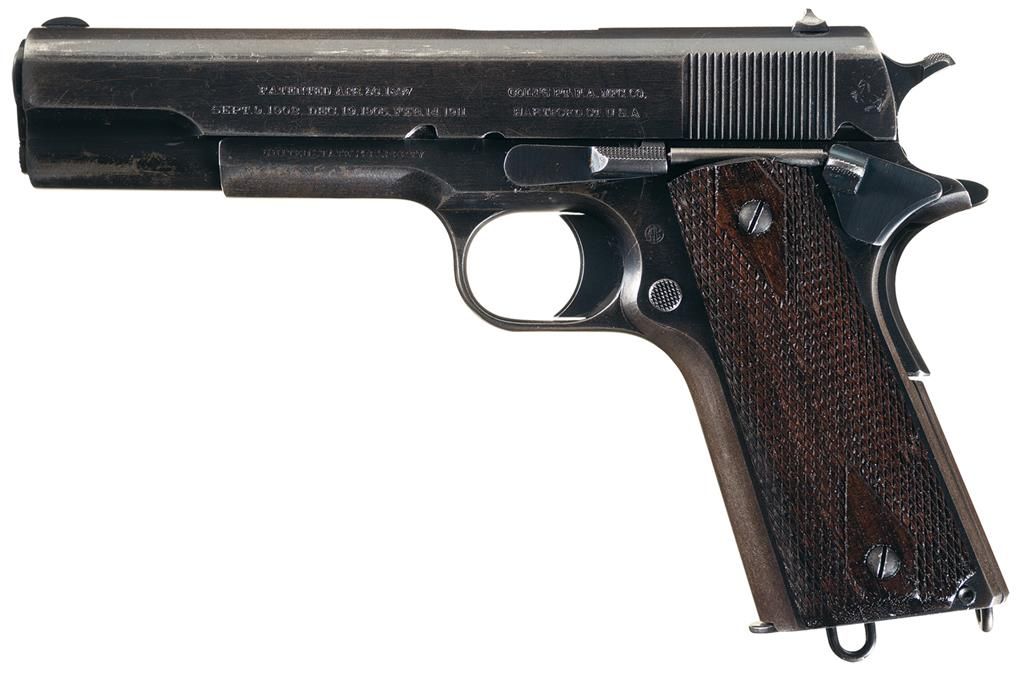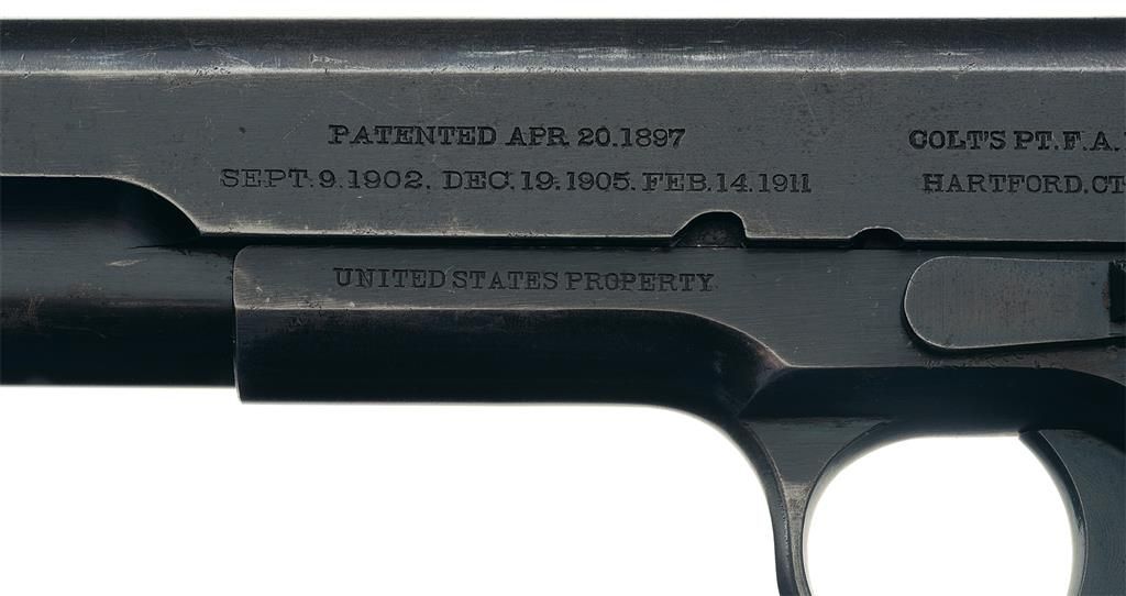 This is a very nice example of an early U.S. Army Contract Colt Model 1911 semi-automatic pistol that was in a lot of 600 pistols that were shipped to the Commanding Officer, Springfield Armory in Dec 1913. This pistol still retains the early short, two-line/two-block slide markings with serifed Roman letters "PATENTED APR.20. 1897/SEPT.9.1902. DEC.19.1905. FEB.14. 911" followed by "COLT'S PT.F.A.MFG.CO./HARTFORD.CT.U.S.A.", with the uncircled Rampant Colt logo behind the slide serrations on the left side. The right side of the slide is marked "MODEL OF 1911 U.S. ARMY", and it is fitted with the early, narrow front sight with the round top rear sight. The forward section of the left side of the frame is stamped "UNITED STATES PROPERTY" with the right side stamped with serial number, "No. 58191". The frame is stamped with the circled initials "WGP" for Major Walther Penfield the US Ordnance inspector. This pistol still retains the thick, early checkered thumb safety, first pattern slide stop without the plunger groove, the short horned grip safety, and the checkered wide hammer spur with the flat mainspring housing. It has the correct, all blued military contract barrel marked with a separate "P" and "H" proofmarks on top of the chamber, with a "J" proof on the left side of the lug. It is fitted with the correct early diamond checkered walnut grips. Complete with an early, half-tone blued magazine with the pinned base and the lanyard loop on the underside.
