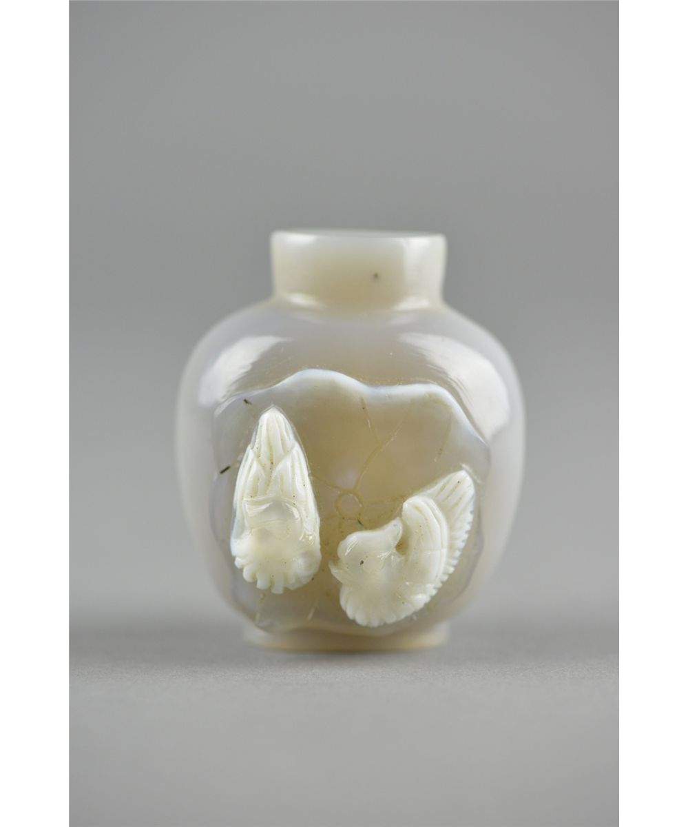 Fine 19th Century Chinese agate carved snuff bottle; ovoid body featuring mandarin ducks in relief; supported on short foot rim; the stone of translucent lavender tone; H: 5 cm, W: 4 cm, 72 grams