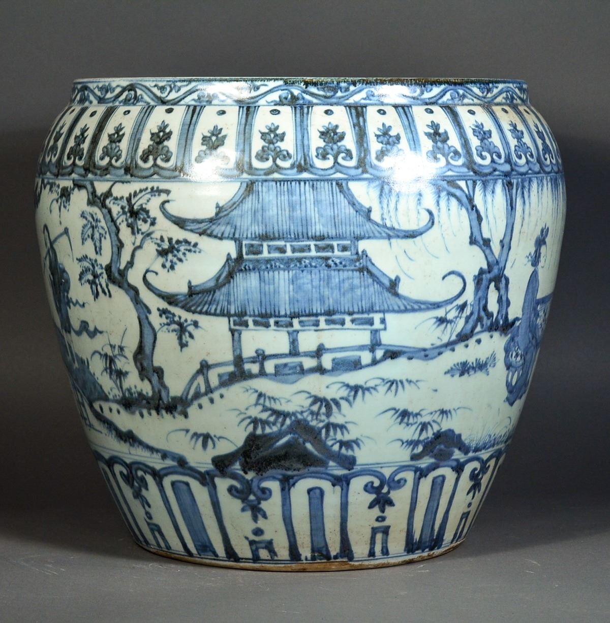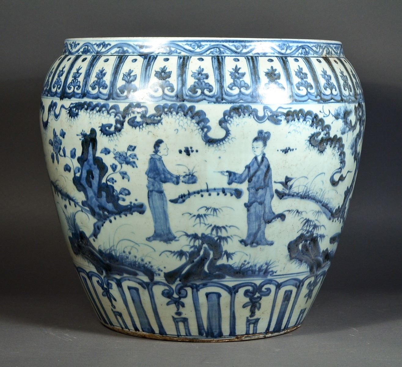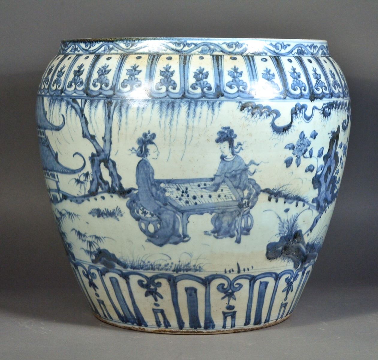 Large 19th Century Chinese blue and white porcelain jar, featuring continuous figural courtyard scene of Chinese ladies at leisure; between upright petal lappets at base and band of petal lappets with enclosed lotus spray below the rim; narrow band of classic scroll decorating the rim; base unglazed; H: 38 cm, D: 40 cm