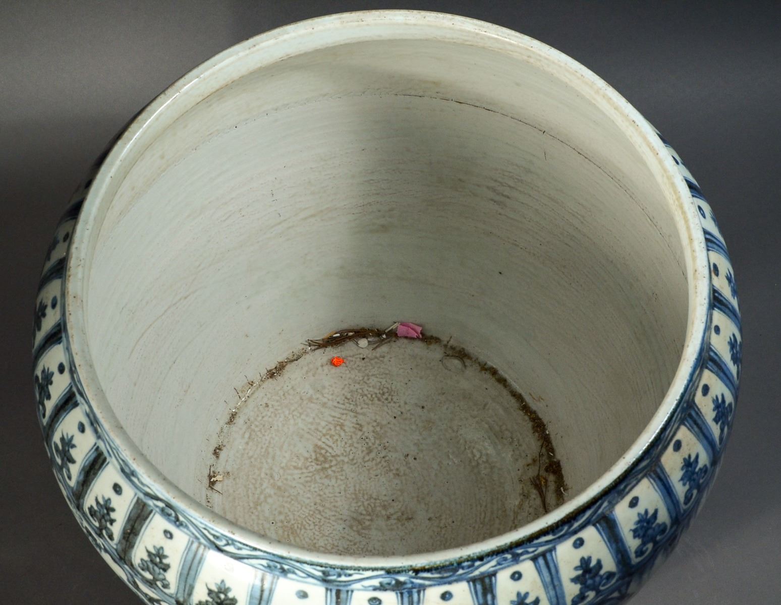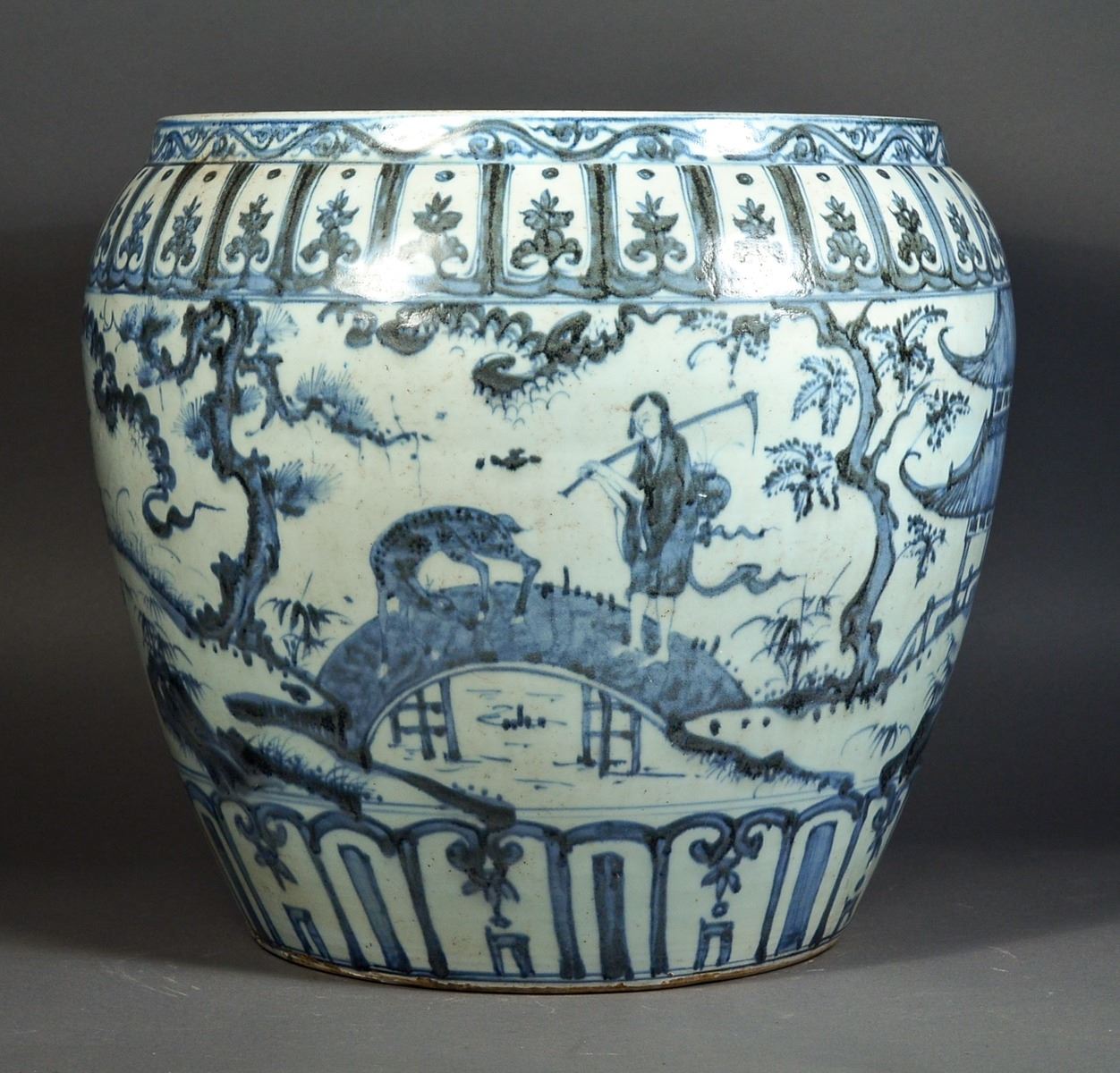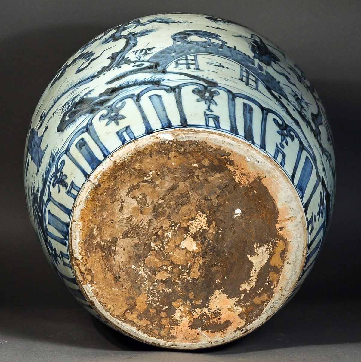 Large 19th Century Chinese blue and white porcelain jar, featuring continuous figural courtyard scene of Chinese ladies at leisure; between upright petal lappets at base and band of petal lappets with enclosed lotus spray below the rim; narrow band of classic scroll decorating the rim; base unglazed; H: 38 cm, D: 40 cm