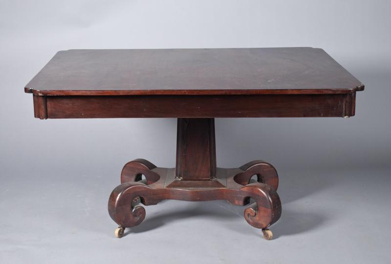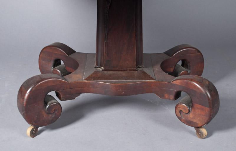 Pedestal base with flared curved legs resting on four castors. 28.5" H x 40.25" W x 50.75" L, Circa 1820's-1850's, some wear to finish, otherwise a fine piece of American history.