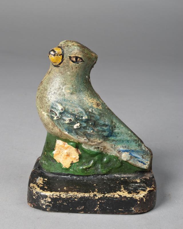 Small painted bird in blue atop a geen rest and resting on a black base, retains it's original paint decoration, 4.875" H x 3.75" W. Circa late 19th/early 20th century. Small paint loss throughout.