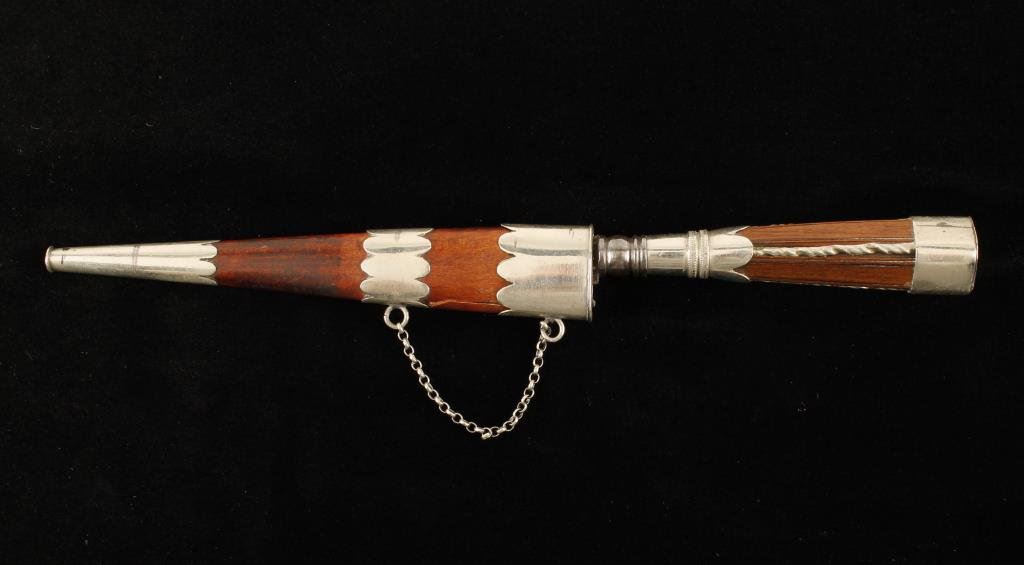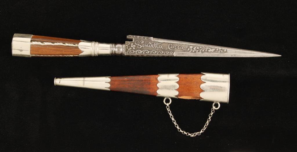 Fine 19th century Italian vendetta dagger probably Sicily. The blade is finely etched “Vendetta Corsa, Gai al del Nemio”. Measures 9” overall with a 5” blade along with German silver mounts. Original scabbard. Black moor on the pommel. Est.: $200-$400