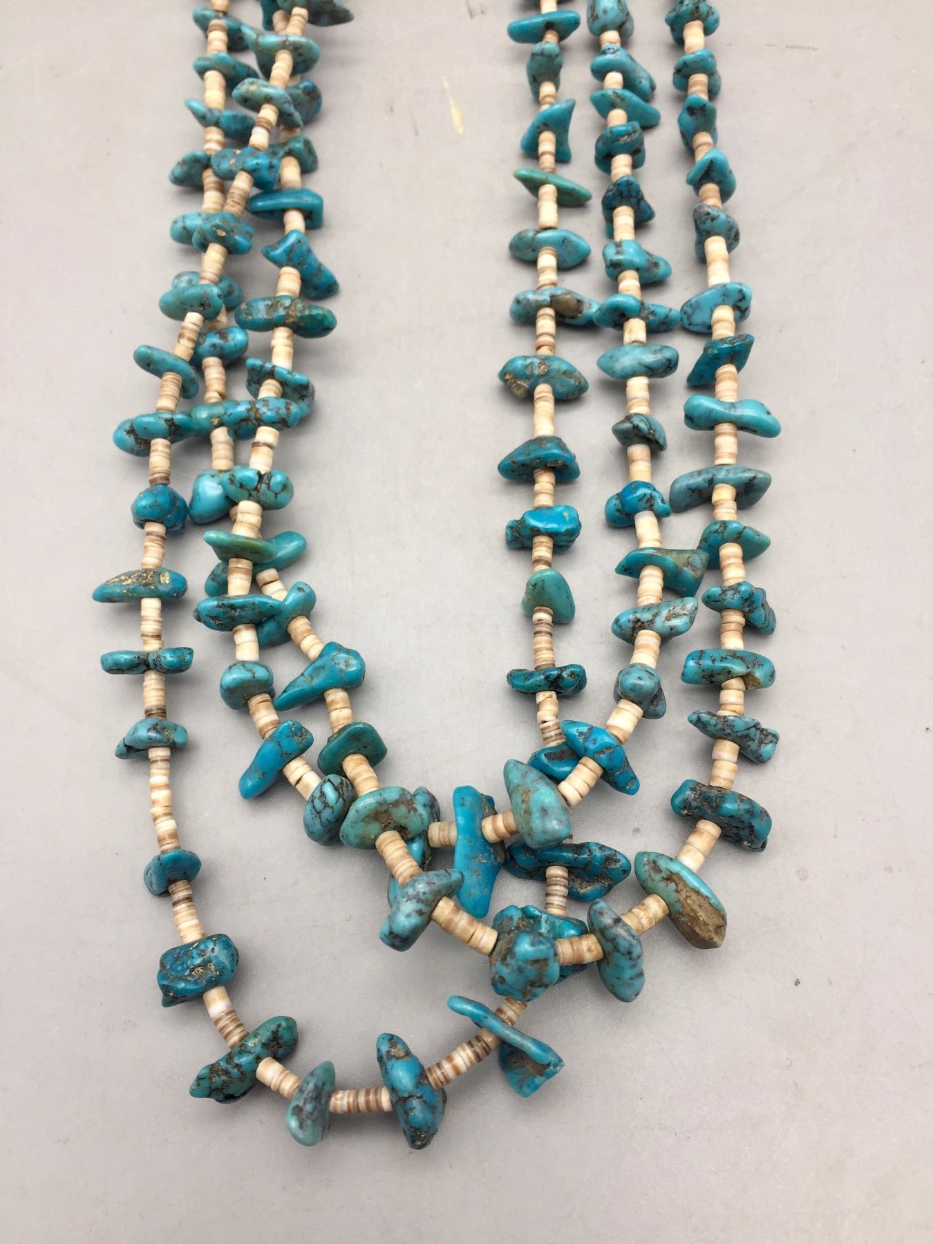 Description: Presented for sale in this lot is a fine, three strand necklace featuring nugget style turquoise and heishi. Maker: Most likely Pueblo made. Approx. Age: Vintage. Size: Fits a 28” neck. Weighs 63.6 grams. Condition: Good for its age, normal wear expected. Please look closely at the pictures - they are an important part of our description. Shipping: There will be a $5 handling / packaging fee for shipping this lot. The actual cost of postage will be added on top of that.