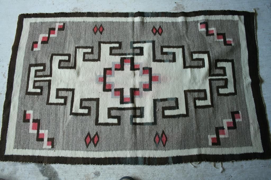 Fine 60x40 Navajo Rug, tan, brown, white and red. Slight fraying on the edge binding. No holes or stains. One side is more faded than the other. Very good condition and very good looking.