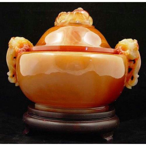 This awesome censer was carved from a piece of fine-grained Agate Gemstone by a Chinese MASTER OF ART from Beijing. The agete was mined in Brazil and then shipped to China for the artist to creature such a WONDERUL ARTWORK. The censer is guarded by a pair of awesome Fu Lions on each side with loosen rings hanging. An awesome dragon is crouching on its top, which makes this cencer full of oriental Majestic touch. With Wood stand but the stand is modern.