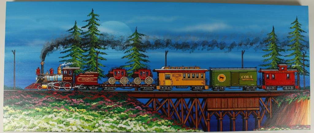 California artist, hand signed lower left corner, depicting a Union Pacific train with Wells Fargo and Colt train cars. Great bright colors! Bio: Fred Bonn was born in California in 1940. Bonn worked in commercial art and technical drafting until 1970 when he began devoting full time to painting. Most of his paintings are of trains and railroads. For many years he maintained a studio-home in Manhattan Beach, California. Source: Edan Hughes, "Artists in California, 1786-1940"