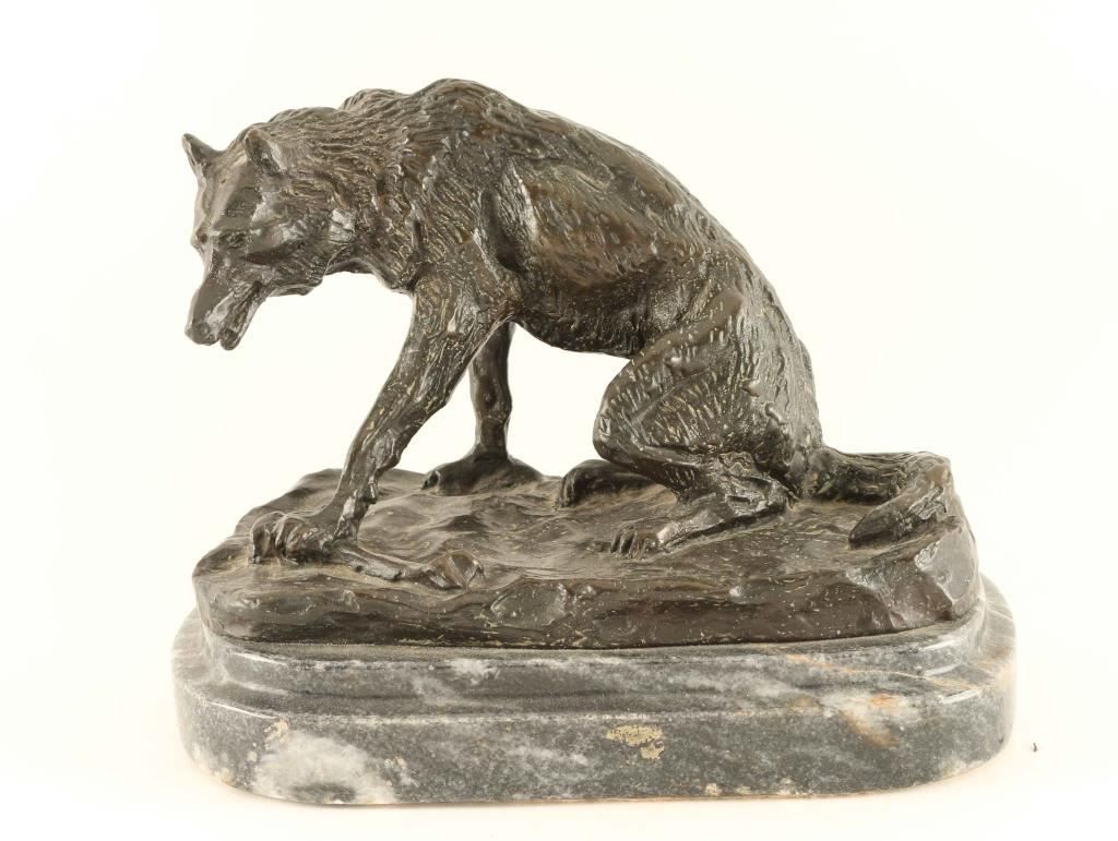 Recast of wolf by C.M. Russell. Measures 6"h not including stone base. 1970s cast by Eagle Art Works, St Louis who did a great job on patina and quality casting. Far superior to recent castings.
