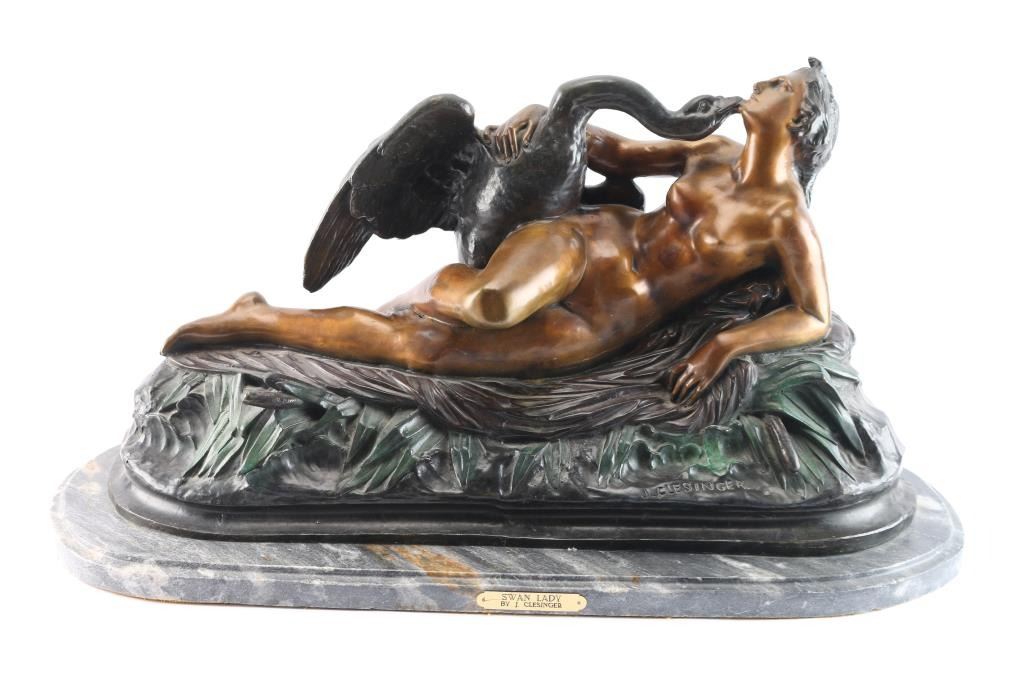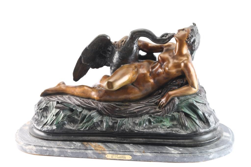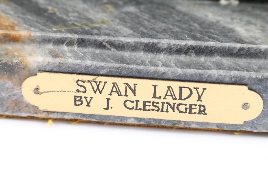 Entitled Swan Lady. Mounted on marble base, signed on colored bronze. Measures 31" x 19" x 11". LOCAL PICKUP ONLY!