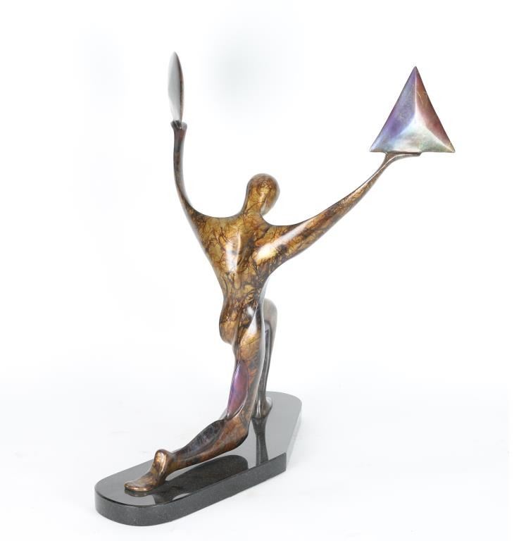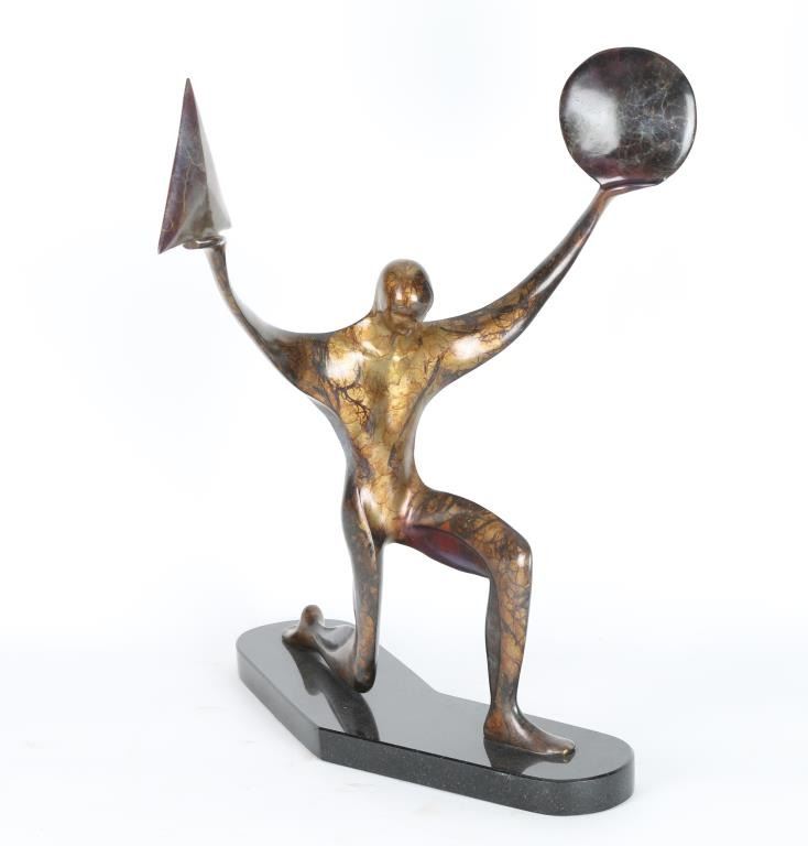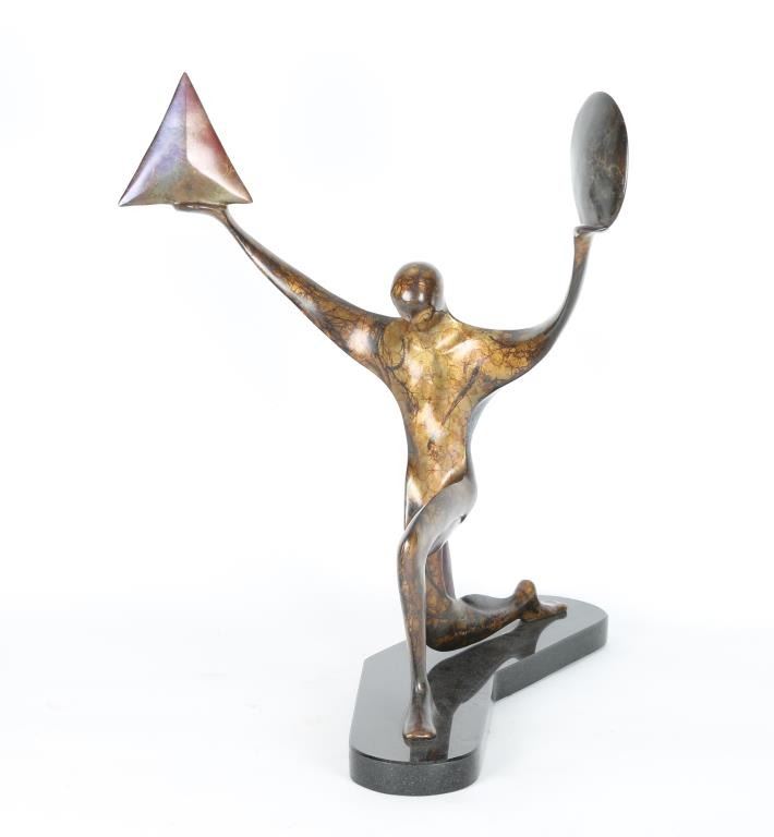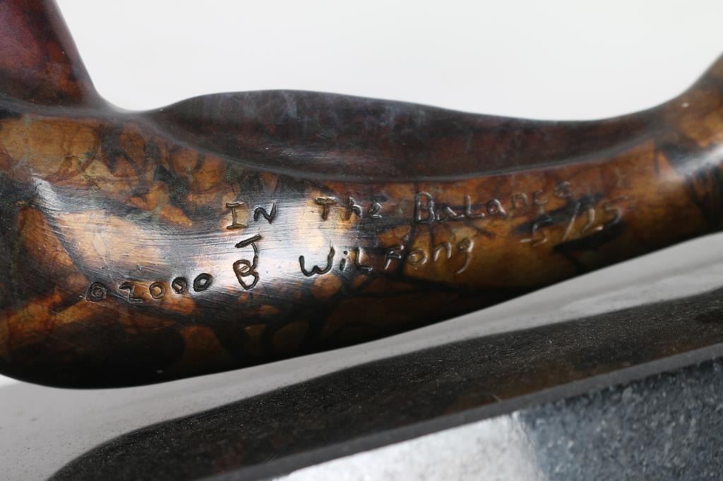 By Bob Wilfog, entitled "In The Balance", Numbered 5/25. Measures 23x20" on marble base. Bob Wilfong (late 20th century) was active/lived in Washington. Bob Wilfong is known for Abstract figure sculpture.