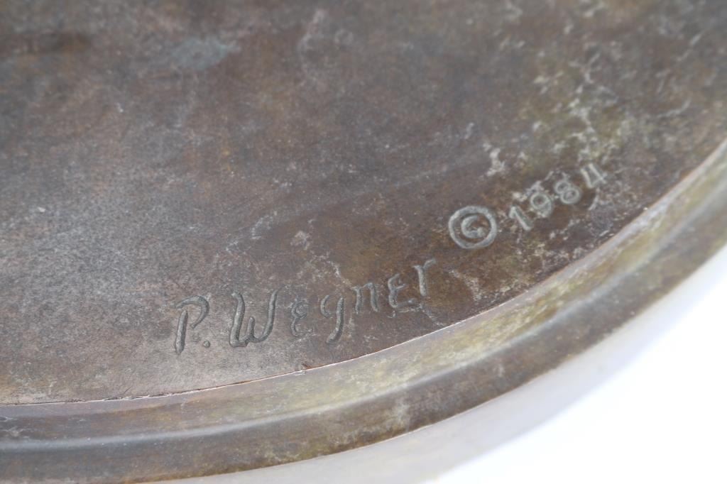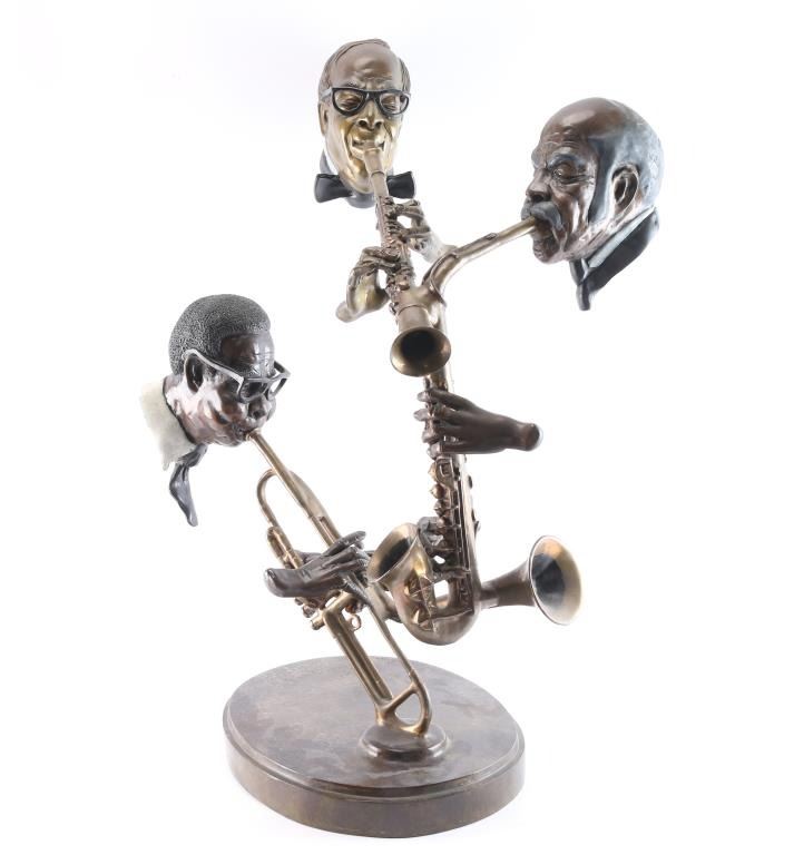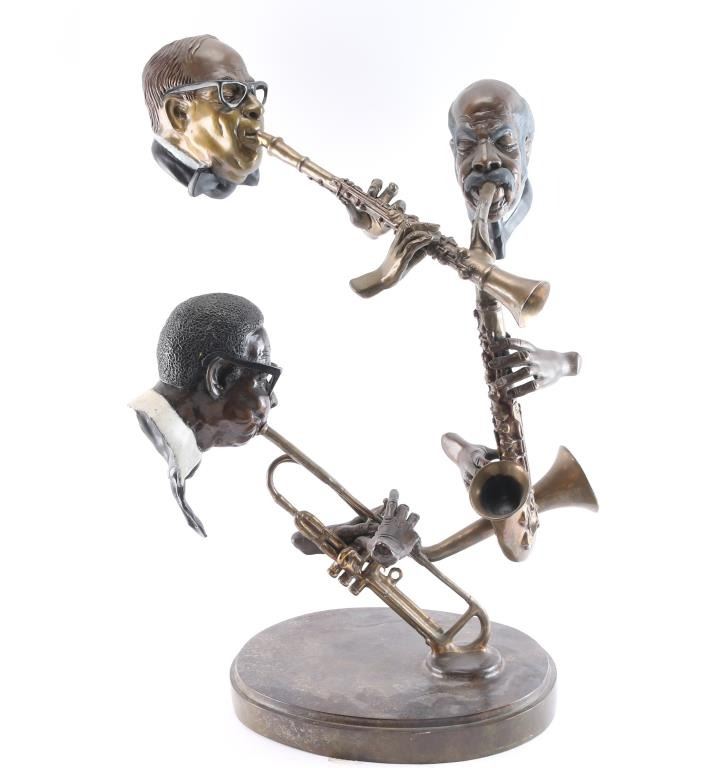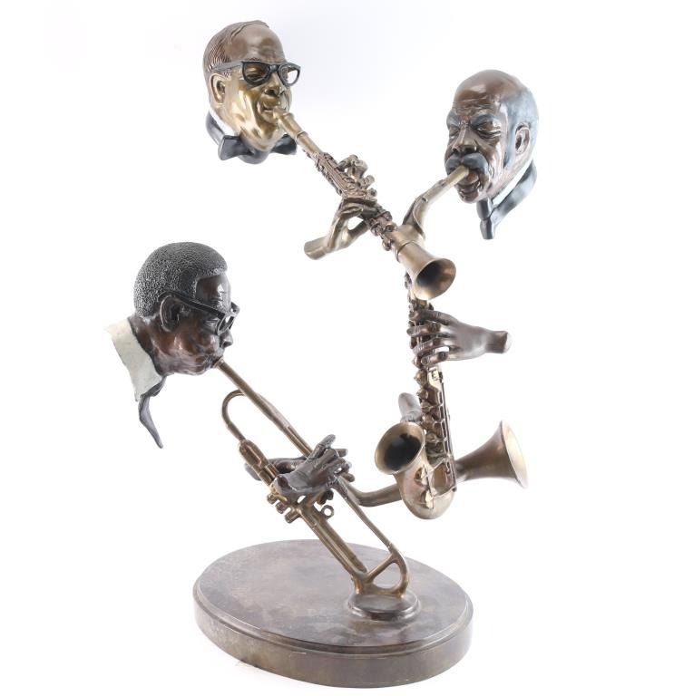 By P. Wegner. Depicts a saxophone player, clarinet player and a trombone player. Signed on base and dated 1984. 30" x 15" at base.