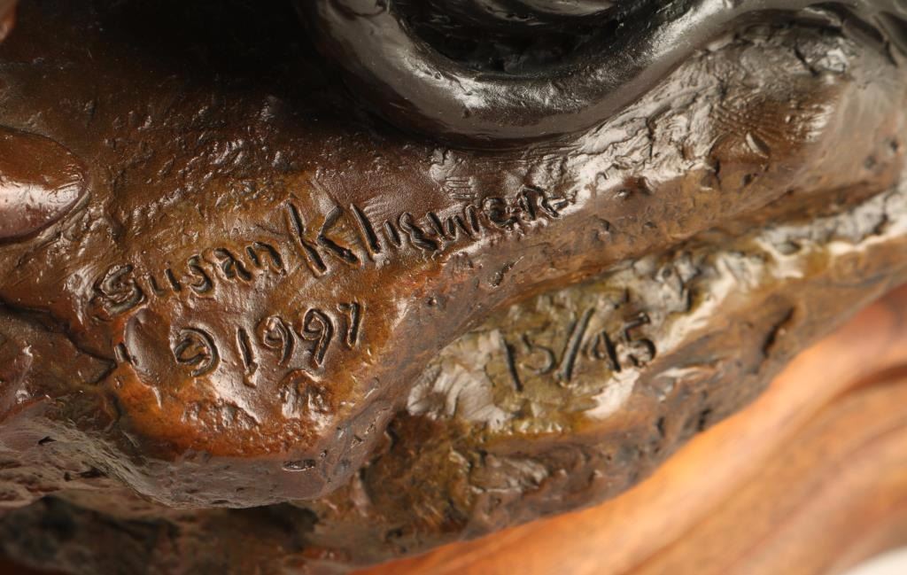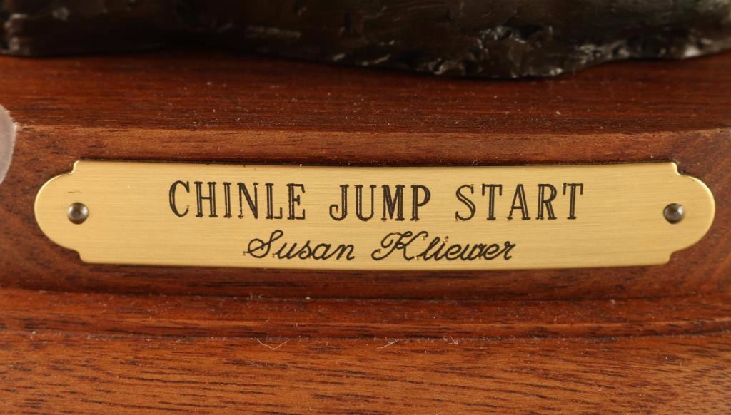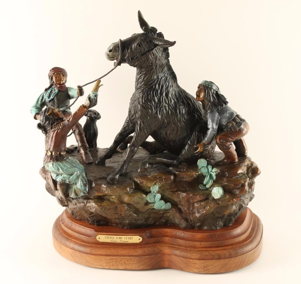 "Chinle Jump Start" by Susan Kliewer 15/45 depicting Hopi family trying to get their mule going. Hand signed on rotating wood base 1987. Measures 19"x16" including base. Susan Kliewer, a native of California, has lived in Arizona for nearly 30 years, five of them at Marble Canyon Trading Post in a remote area of Northern Arizona near the Colorado River. Dreams of horses, deserts, canyons, rivers and sunsets have been her constant companions since she was a child. Susan won a competition to create a monument of Sedona Schnebly, in honor of one of the founders of Sedona, Arizona. The ten-foot tall bronze figure was installed in front of the Sedona Library in 1994. Kliewer's life-size fountain portraying the Sinagua people and a fountain of a Hopi Water Maiden are also to be found in Sedona. "My work" Kliewer says, "aims to show the common thread that underlies all human experience, and which I hope brings us to a greater understanding between all peoples." Susan often uses her Navajo friends as models, and has attracted major collectors from all over the world.