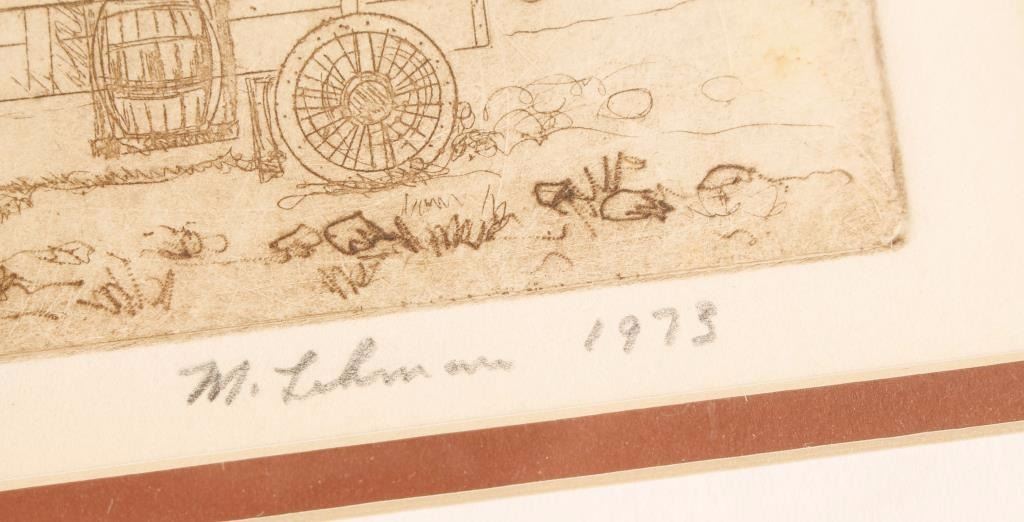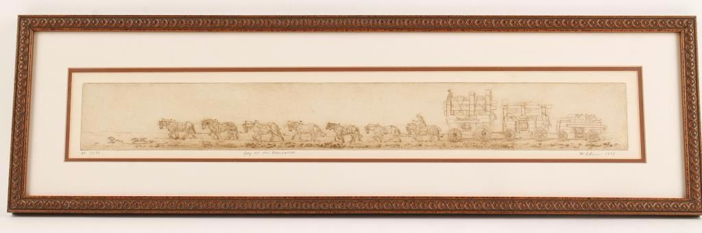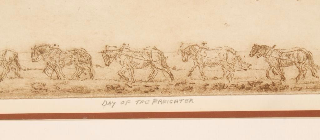 Entitled "Day of the Freighter' artist proof 75th edition, hand signed in pencil lower right hand corner and dated 1973. Double mat in period frame. Image size is 22 1/2"x4 1/2".