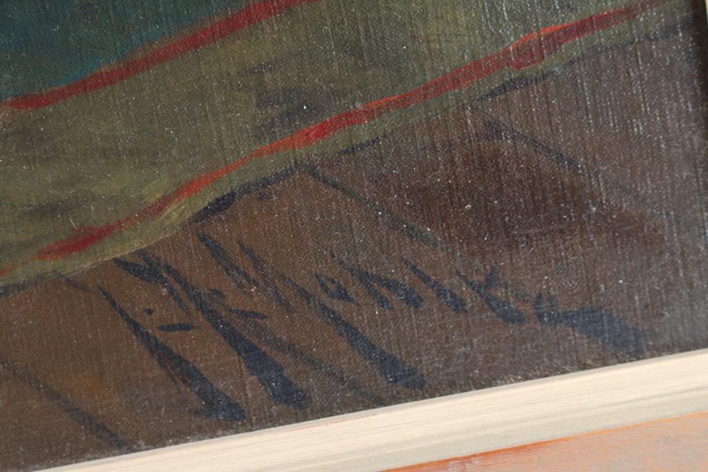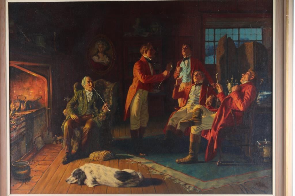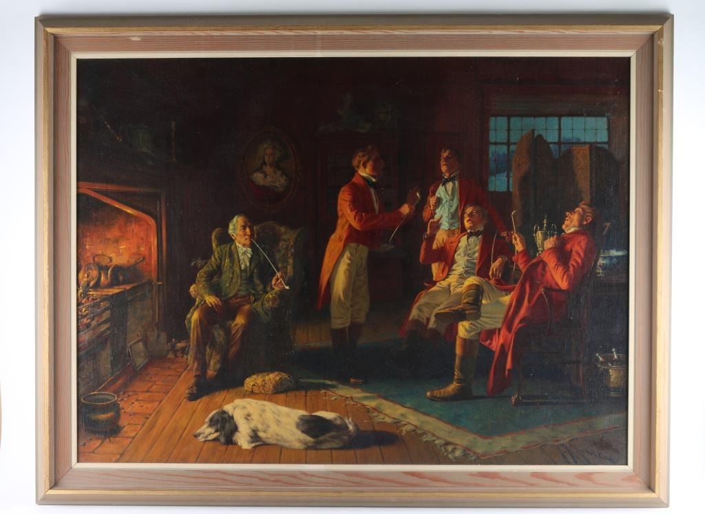 Depicts five English Gentlemen with dog in front of fireplace. The print measures 39x28.5". The frame measurements are 45" x 35". The frame has minor scuffs and gouges. Minor damage to the paper backing. Overall good condition.