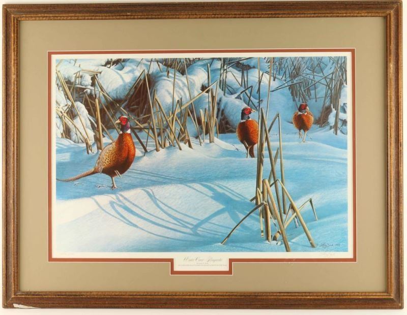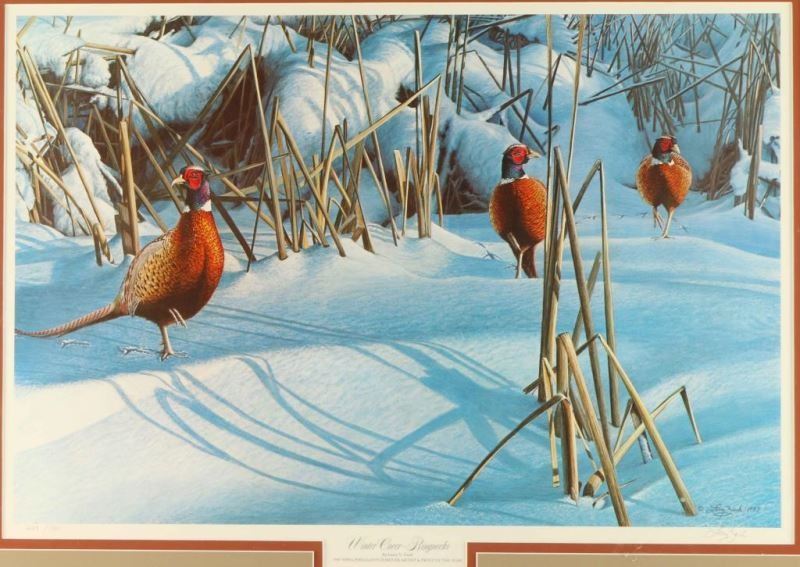"Winter Cover-Ringnecks"1987 Iowa Pheasants Forever Aritst & Print of the Year 209/500. Signed in pencil lower right. Image measures 16 1/2"x24 1/2" in double mat and wood frame.