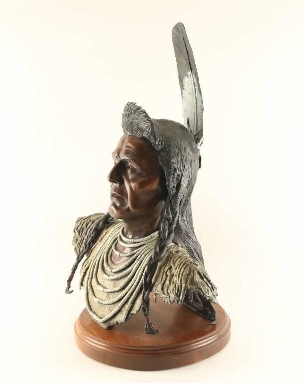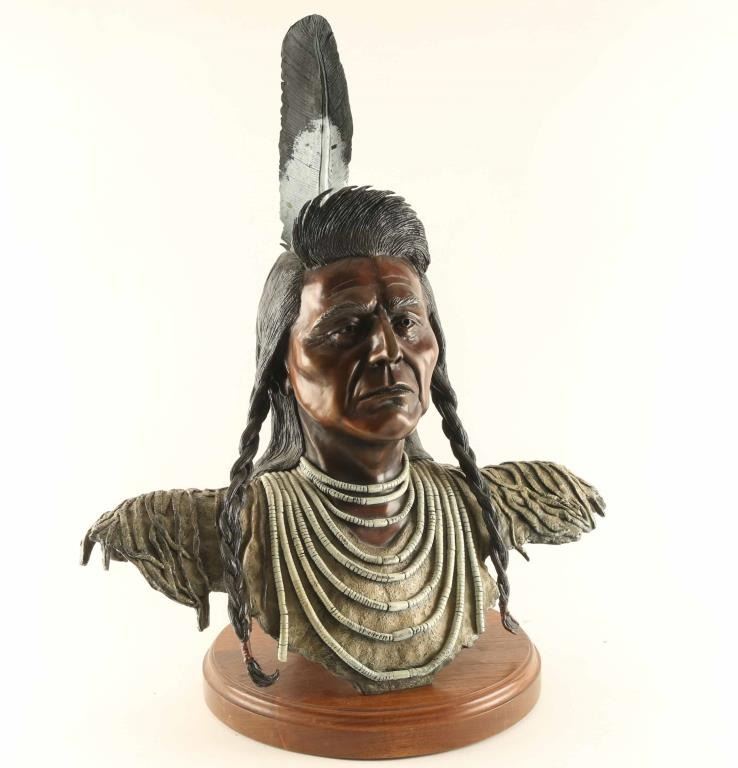 by Cameron Blagg of Noxon MT, entitled Chief Joseph of the Nez Perce. Signed in bronze mounted on wood base measures 29"x24".