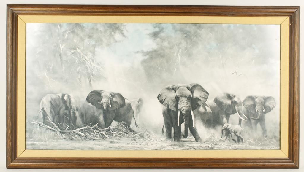 Hand signed and dated 1982 by David Shepherd. Measures 39 1/2"x19 1/2", framed and matted. Bio- Richard David Shepherd CBE FRSA (born 25 April 1931) is a British artist and one of the world's most outspoken conservationists. He is most famous for his paintings of wildlife, although he also often paints steam railways, aircraft and landscapes. His work has been extremely popular since the 1960s in limited edition print reproduction and poster form, as well as other media such as Wedgwood limited edition plates. He has written five books about his art. David Shepherd was born in Hendon, London, England. As a child he lived in Totteridge, North London, and he won a childrens' painting competition in a magazine called Nursery World when he was eight years old. He then attended Stowe School in Buckinghamshire. Upon leaving school he traveled to Kenya with the hope of becoming a game warden, but was rejected. He returned to the UK but was rejected by the Slade School of Fine Art in London. However, he was taken in by the artist Robin Goodwin who trained him for three years. Neal Brown said in Frieze magazine: "David Shepherd is one of the most financially rewarded painters in the UK, but his critical status is less than negligible. Although considered the supreme master of Bad Art, Shepherd has brought pleasure to millions, as seen on the many table mats, posters and commemorative plates that bear his work." David Gower said, "There is a sense of the atmosphere of the African bush that emanates from all his work. He became interested in conservation during an early expedition into the African bush, where he discovered a poisoned water hole with a large number of dead zebra. He has since become an outspoken world-known campaigner, and devotes much of his time to this. He is also a steam railway enthusiast, but said in a letter to the UK Railway Magazine, "you can always build another steam loco but you can't build another tiger." One of his best known paintings is called Tiger in The Sun, painted in 1977. He is also known for his paintings of elephants. "Tony DaCosta Collection" of noted hunter and owner of Safari Headquarters Ltd. from Carson City, NV.