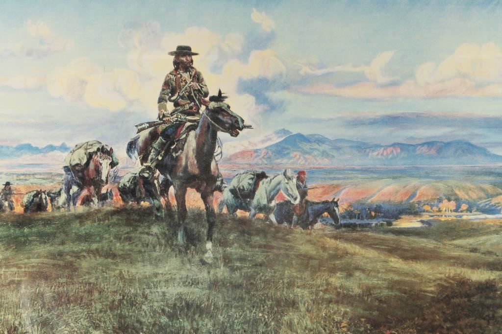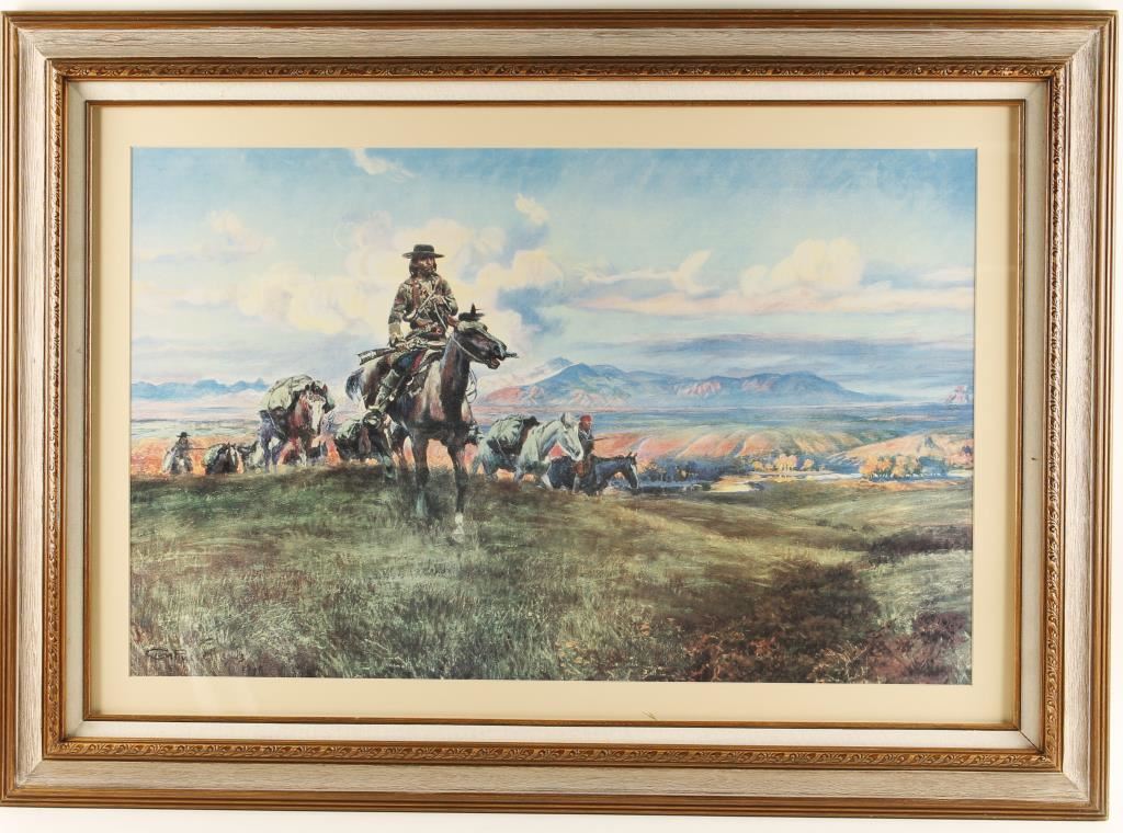 Shows a mountain man with his pack team loaded down with trading goods. Nicely framed and matted. Measures 32"x43".