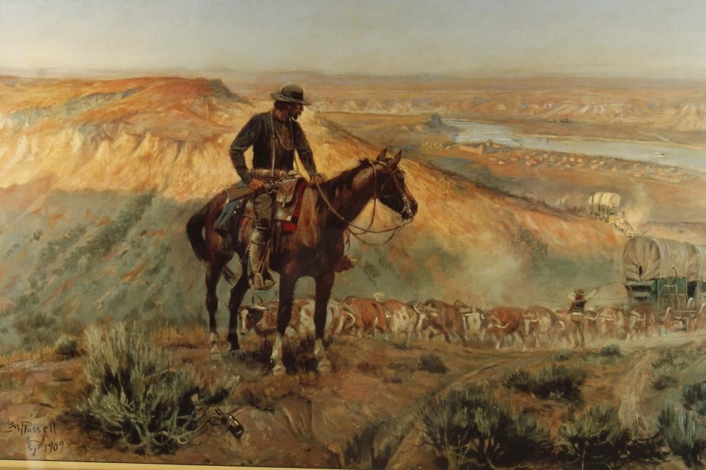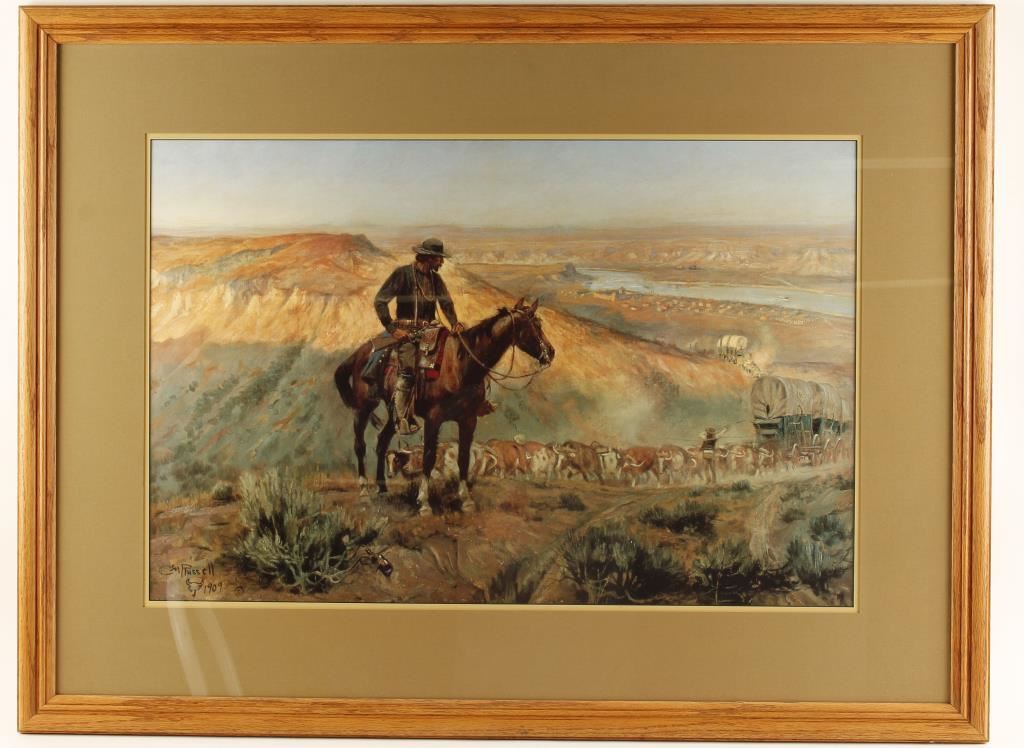 Print by C.M. Russell shows the wagon master watching over his wagon train from a high vista point. Nicely framed and matted. Measures 30"x40".