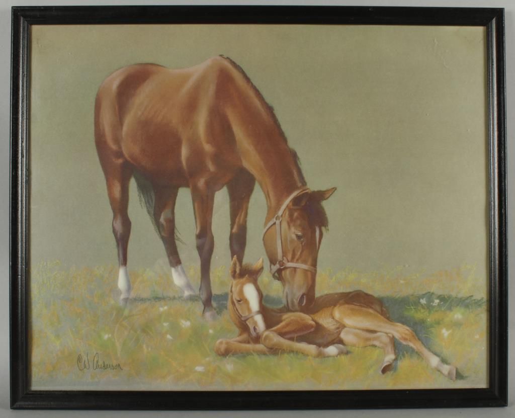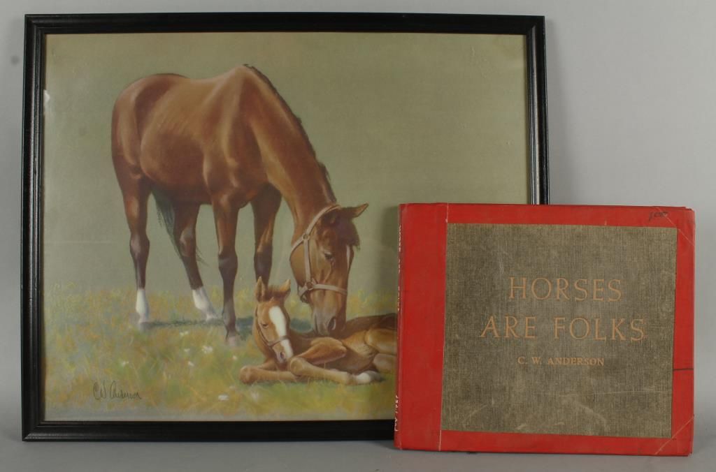Depicting a horse and foal, image size 19.5" X 15.5" in black frame. Includes 'Horses are Folks' book.