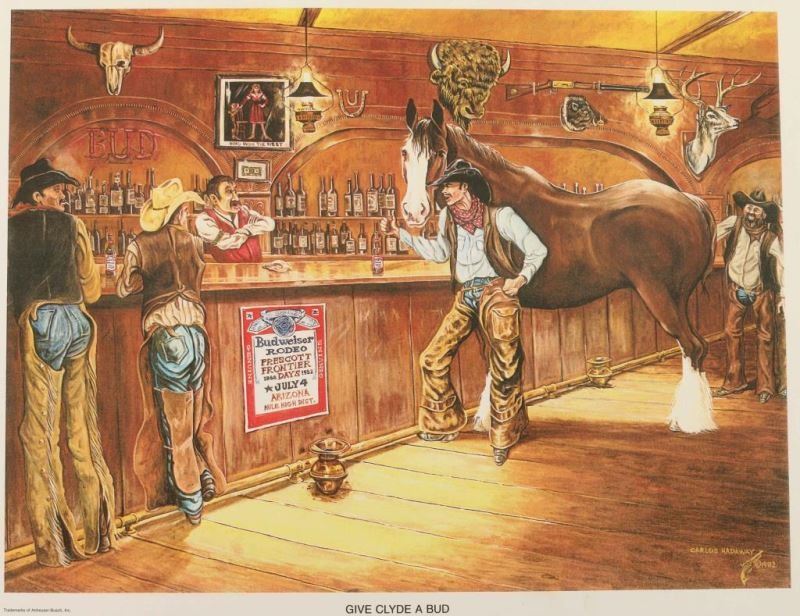 "Give Clyde a Bud" print only, signature lower left. Image measures 8 3/4"x12". Carlos is perhaps most well known for his license with Anheuser-Busch, where he created a series of six western prints featuring Budweiser.