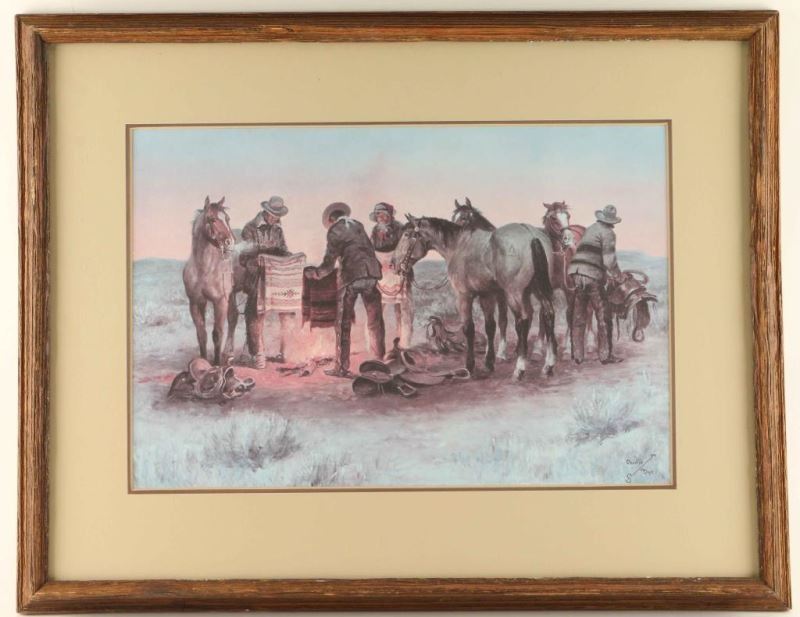 Depicting cowboys warming up blankets for their horses. Signed lower right. Image measures 11 3/4"x17 3/4" in double mat with wood frame.