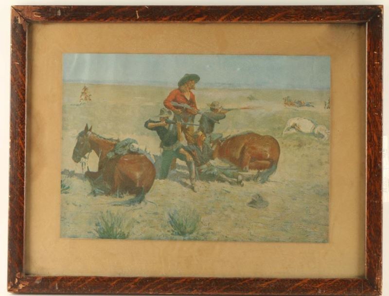 Copyright 1908 Image size 15"x10" in wood frame. Depicting cowboys at a shoot out.