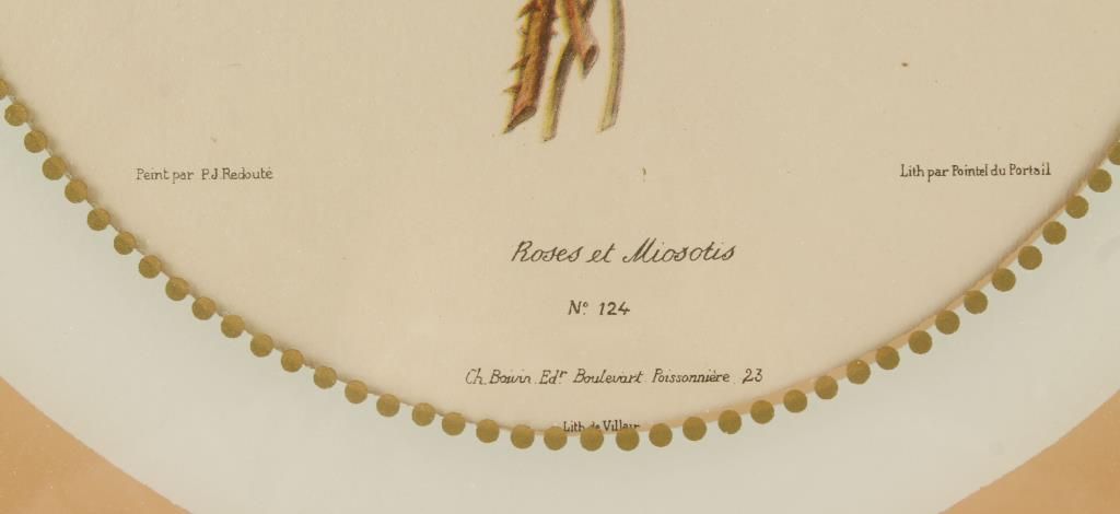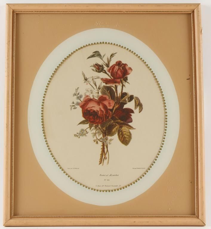 Depicting roses. Titled "Roses at Miosotio". Framed 15" wide x 17" high.