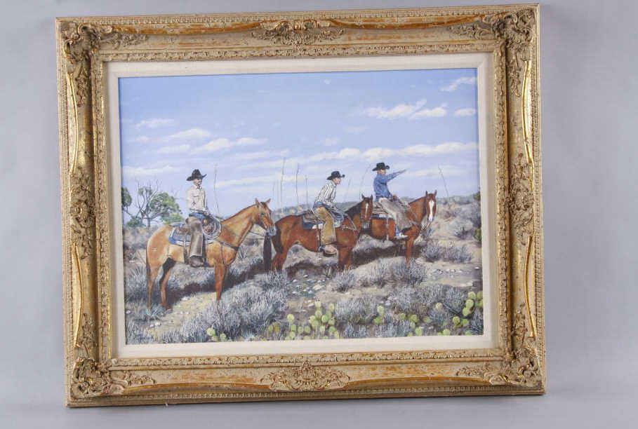 Fine Art Print on Canvas by Don HambrickDepicting cowboys on horseback, in gold frame, image measur