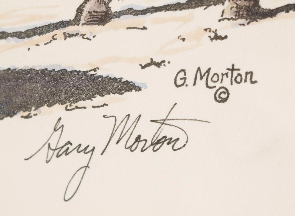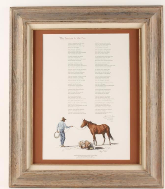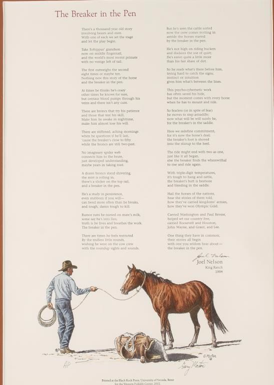 by Gary Morton entitled "The Breaker in the Pen" artist's proof. Poem is by Joel Nelson, King Ranch 1994. Image measures 14"x19". Gary Morton began cowboying on different ranches as a teen and ultimately became wagon boss on the historic Bell Ranch in New Mexico. The life of cowboying makes Gary more than familiar with his subjects. “I don’t just paint for myself, but to honor the working cowboy.” Gary’s paintings are realistic, accurate and his attention to detail allows him to be honest to himself and the people he paints. Over the years he has shown his paintings in many shows, galleries, and museums throughout the country. Gary continues to create authentic paintings of the contemporary working cowboy. He has enjoyed many opportunities to create special commission works for collectors. From cowboypoetry.com