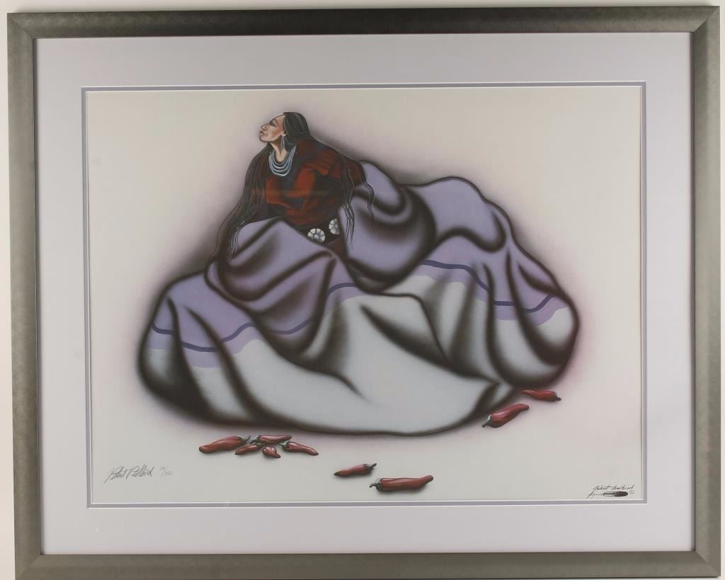 Artist Robert Redbird 38/550 of Native American woman with red chili peppers. Double mat with metal frame. Image measures 29"x22".
