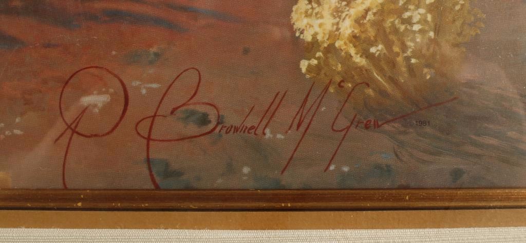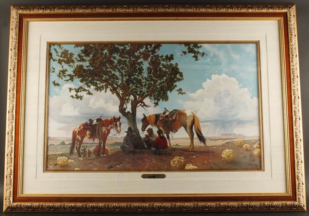 by R. Brownell McGrew. Entitled Time to talk. Image size is 30"x19" the brass placard is engraved wrong, and says Howard Terpning. This is a McGrew. Framed and matted and beautifully. Known for highly realistic Indian portraits with rich skin tones as well as Southwest and California desert landscape paintings, R Brownell McGrew showed early art talent in his home town and birth place of Columbus, Ohio.He moved to California with his family when he was a child and enrolled at the Otis Art Institute, studying with Ralph Holmes. Although he preferred portrait painting, he won recognition for landscapes and was so proficient technically that he spent his last year at Otis teaching. He worked as a commercial artist for M.G.M. and Columbia movie studios and then discovered a love for desert painting. He was also challenged by portrait painting, especially Navajo and Hopi Indians subjects from Arizona and New Mexico. His goal was to have a painting look wet after it was completed, and to achieve this effect, he mixed his colors to get a luminosity by mixing oil paint, linseed oil, and turpentine, but he never used glaze or lacquer. He lived in LaQuinta from 1960-1965, when he and his wife moved to Cottonwood, AZ, and from there to Quemado, NM, 1972-84. From 1984 until his death in 1994, they lived in Sonoita, AZ.
