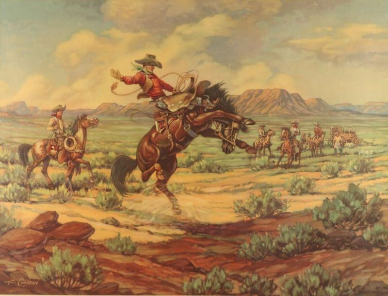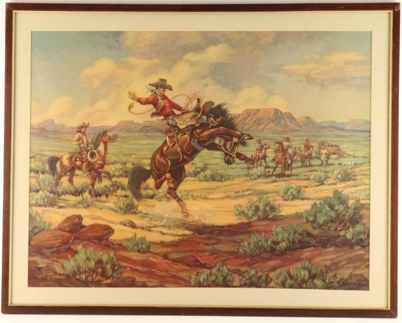 by noted western artist Til Goodan depicts a western scene in wood frame image size is 281/2"X23"