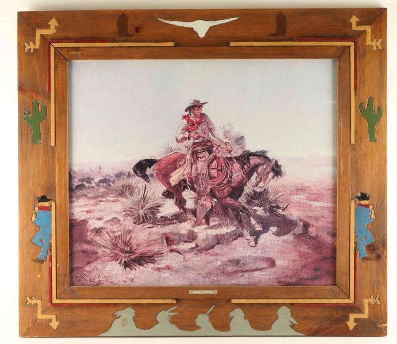 by CM Russell depicting a cowboy on horseback in custom carved frame with western motif. Image size is 251/2"X22".