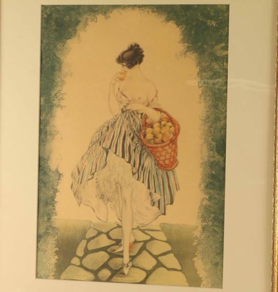by noted artist Louis Icart, 20"x13.5, depicting nude lady with apples, entitled Basket of Apples 1924, in gold frame.Bio= Louis Icart is a French artist best known for his drawings of glamorous women—often erotic or mildly humorous in tone—as well as for his depictions of 1920s Paris life. He was born in Toulouse, France in 1888, and began drawing at a young age. In 1907, he moved to Paris and began studying painting, drawing, and printmaking. Influenced by Jean Antoine Watteau, François Boucher, and Jean Honoré Fragonard, he became a major figure of the Art Deco period, with his work surging in popularity in both the United States and Europe throughout the 1920s and 1930s. He also worked as a designer in fashion studios during a time when the industry was undergoing a major change, moving away from the conservatism of the 19th century towards a more progressive simplicity. He died on December 20, 1950, at his home in Paris, France.